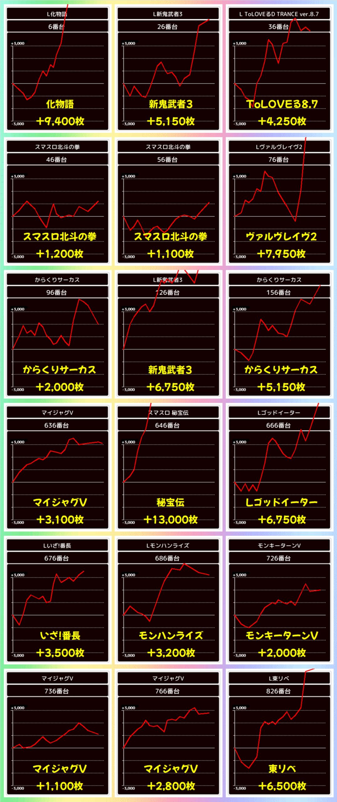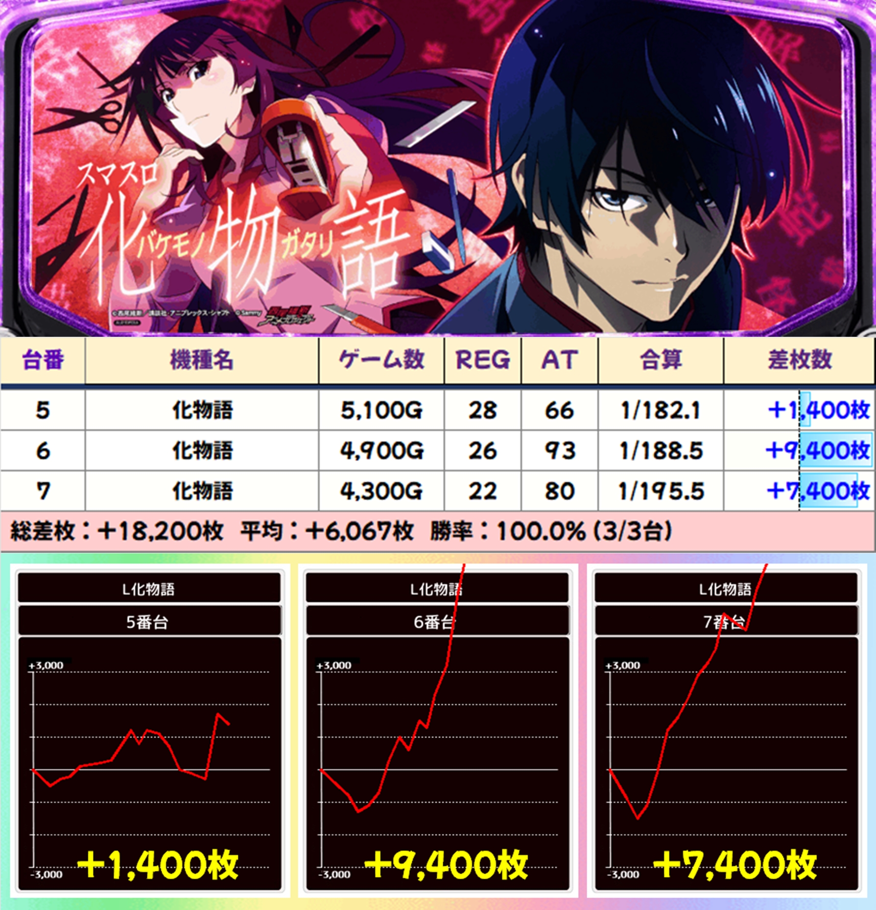 化物語の並びは+9400枚、+7400枚の爆裂台が出現し、平均で+6067枚という素晴らしい結果に。