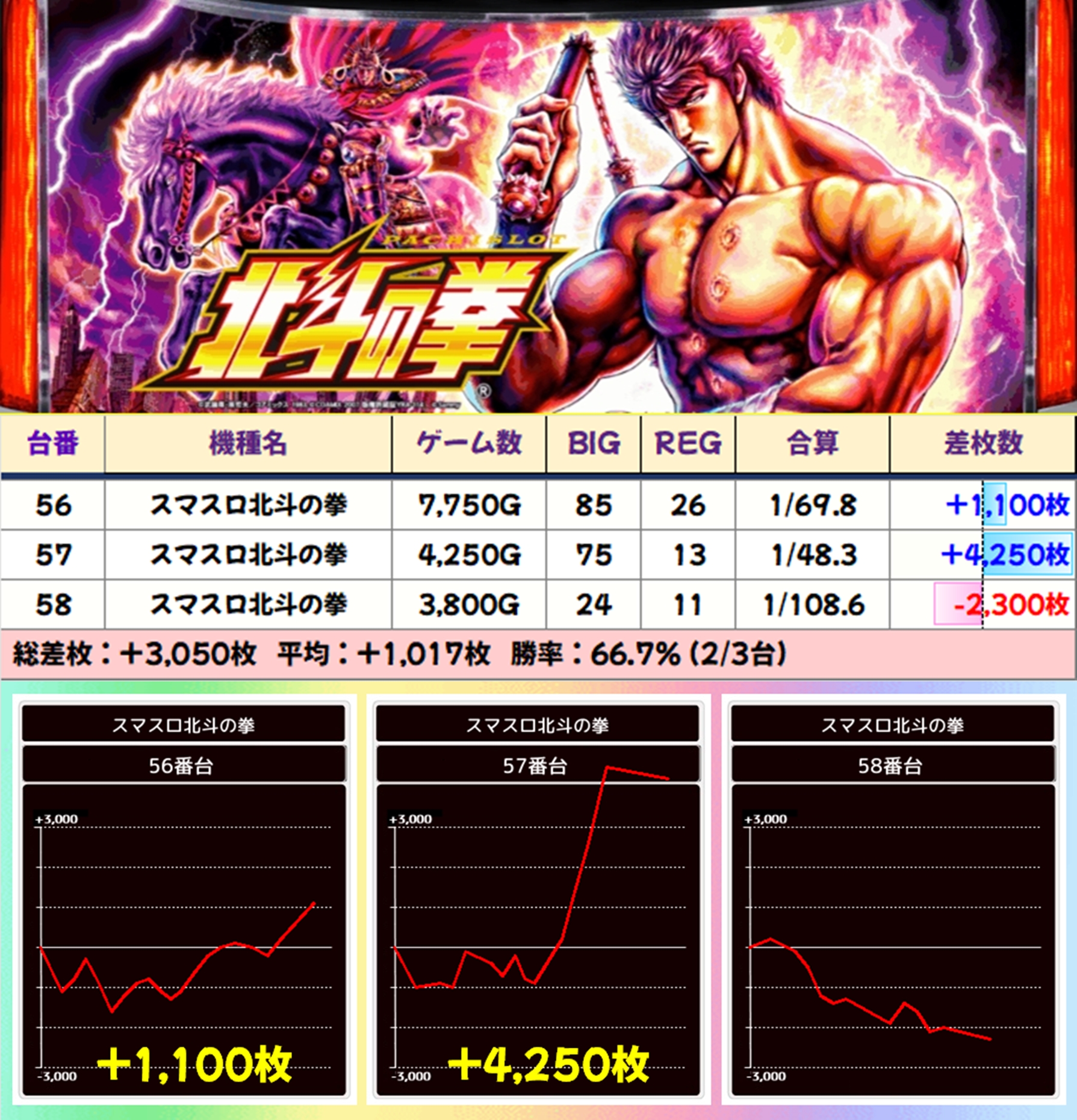 【3台並び】スマスロ北斗の拳(56-58番台)→平均+1,017枚