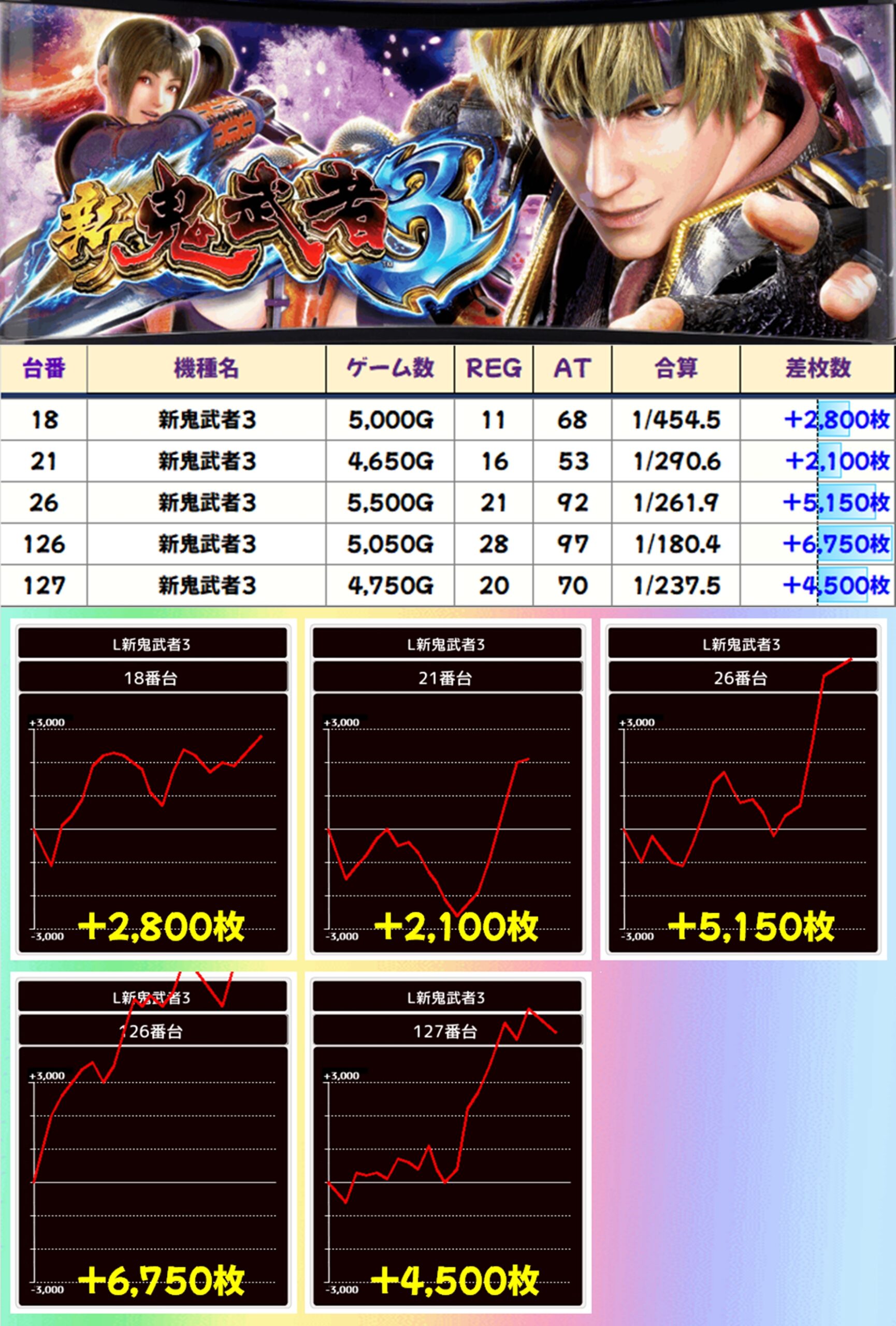 新鬼武者3も末尾⑥番台から大量出玉が出現。その他合計5台の優秀出玉を確認することができました。
