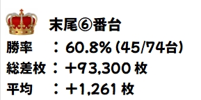 6のつく日におなじみの末尾⑥の仕掛けは、総差枚+93300枚となり、平均で+1261枚という好成績を残しました!