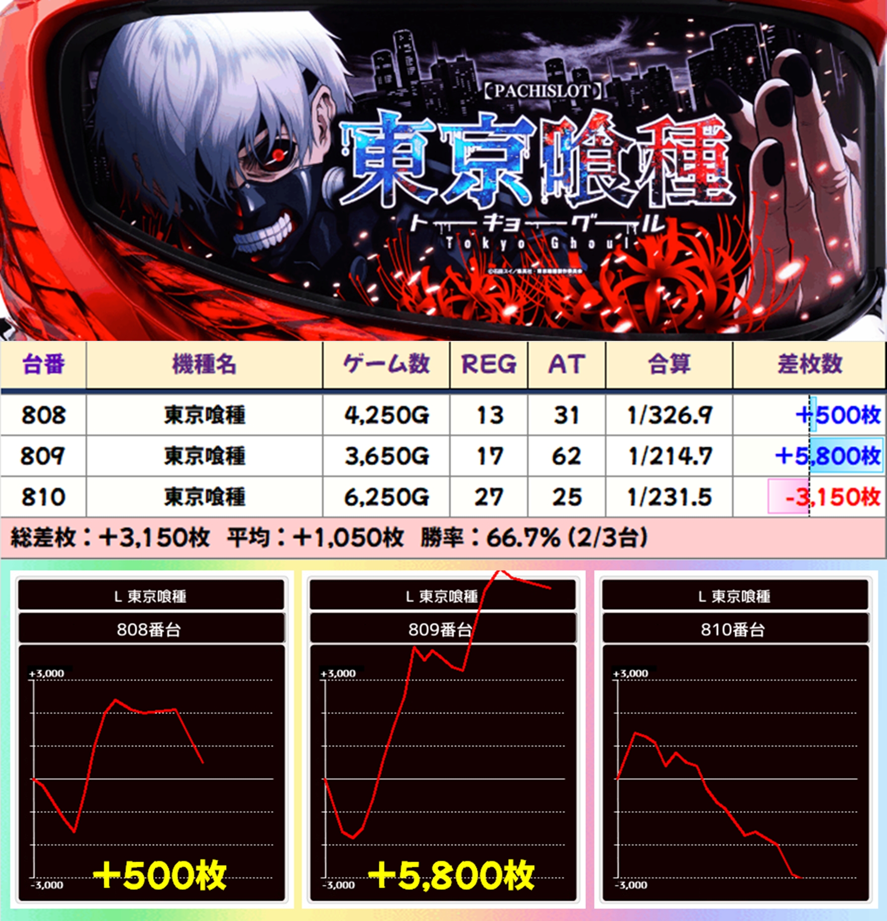【3台並び】東京喰種(808-810番台)→平均+1,050枚