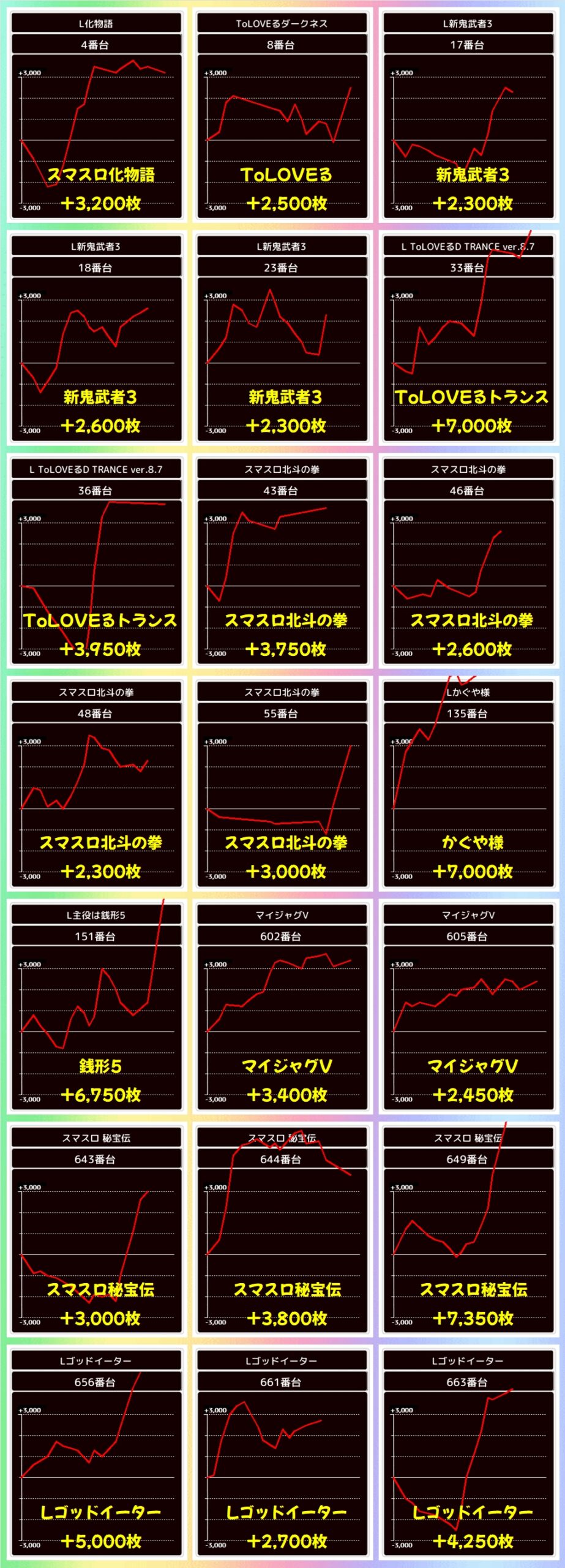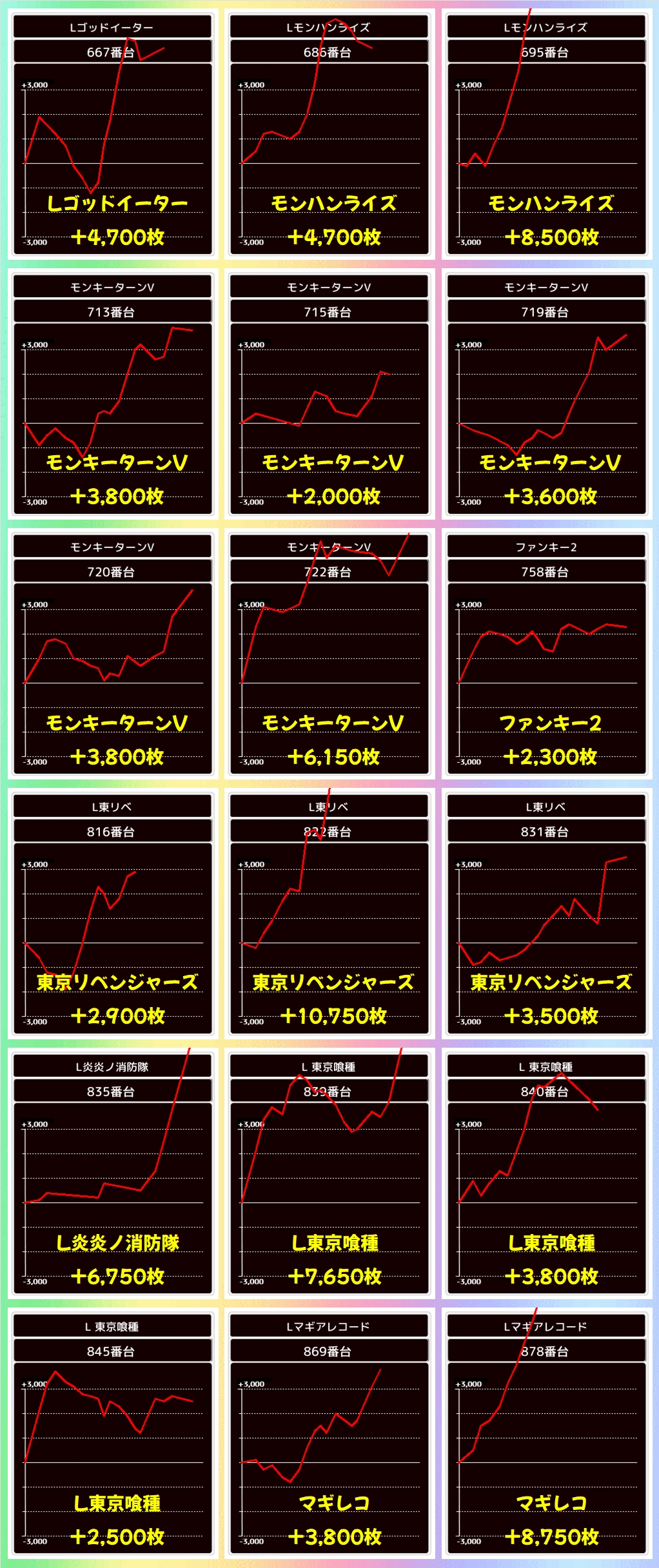 上記の機種からは大量出玉を確認でき、無職転生からは+7000枚、いざ!番長からは万枚オーバー台が出現していましたよ!