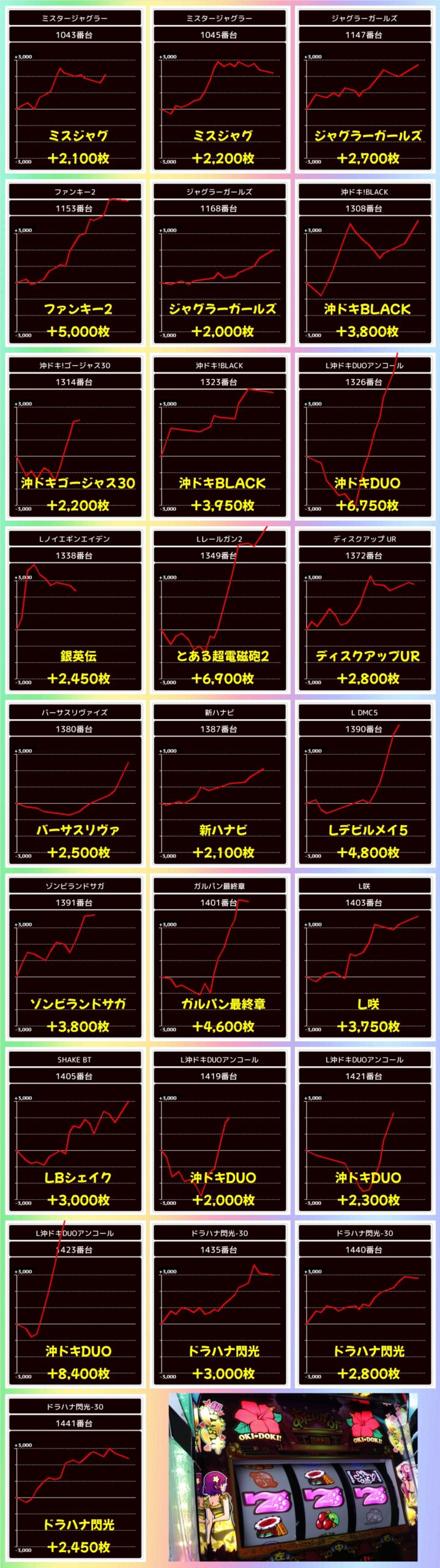 0の日機種からも単品を多数確認でき、新台の沖ドキDUOアンコールからは+8000枚超の大量出玉が出現していました!