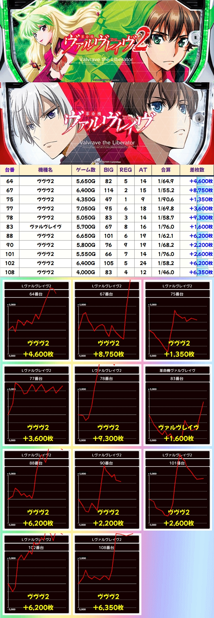 本日も毎日オススメ機種のヴァルヴレイヴシリーズとからくりサーカスから優秀台を確認でき、ヴァルヴレイヴ2からは+9000枚超に加えて+8000枚超の大量出玉が出現!