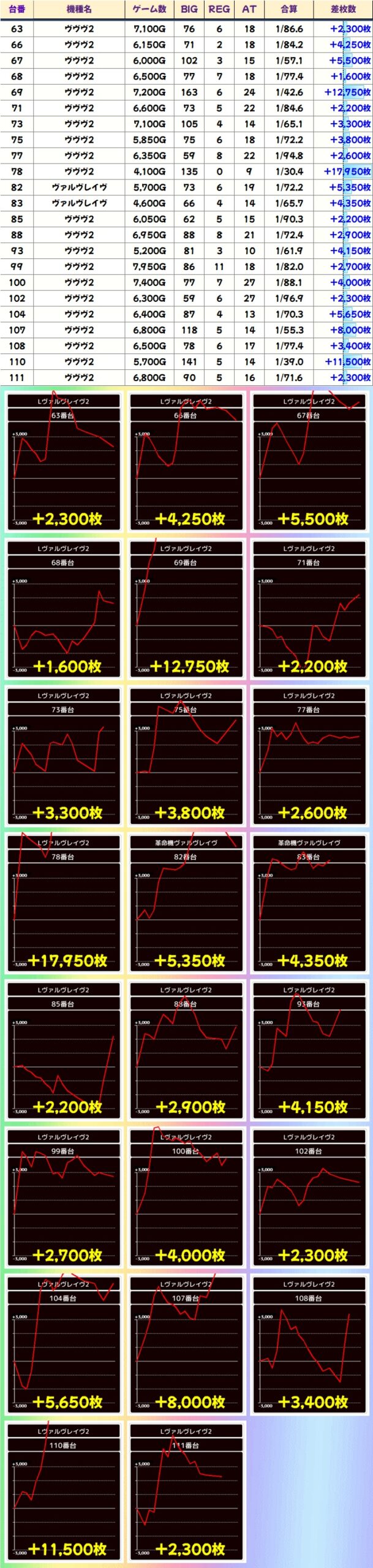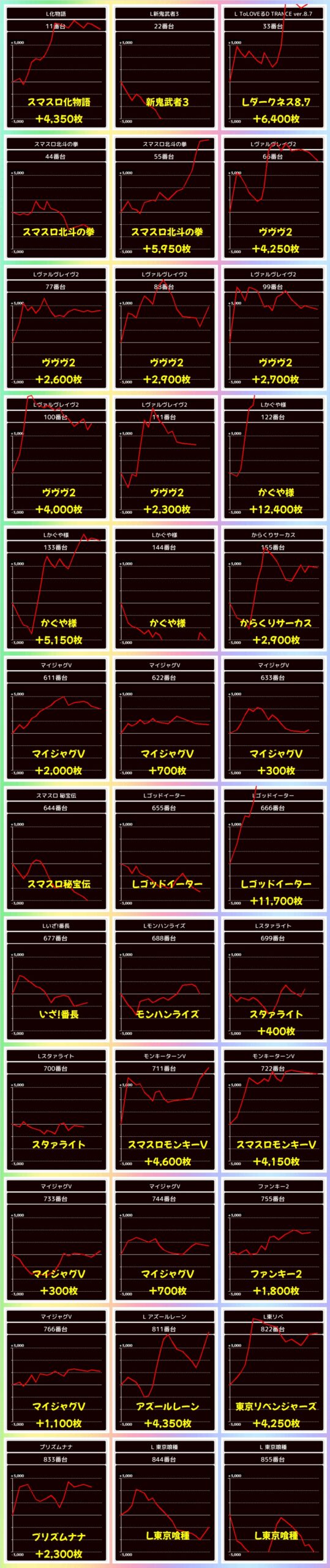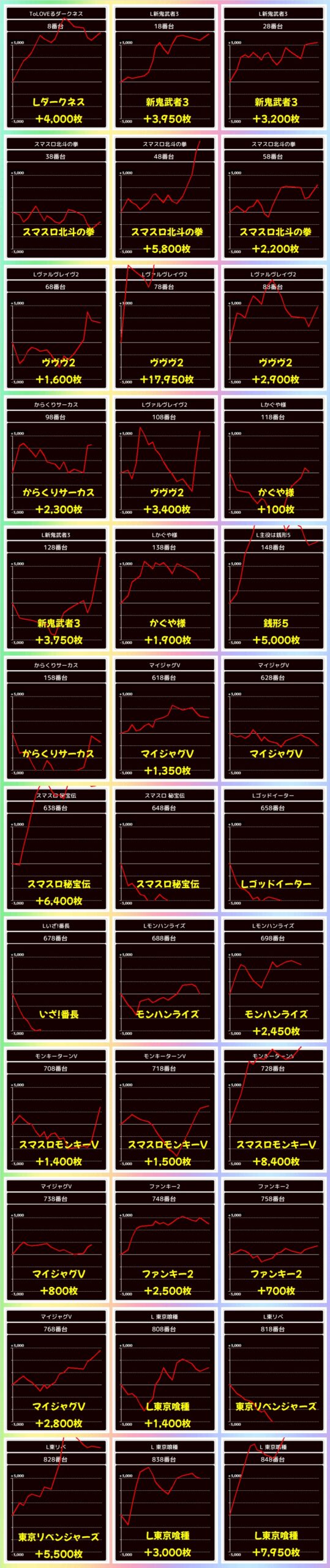 この日は総差枚19万枚超で平均+258枚の好成績!万枚オーバーが13台、3000枚超が約100台と大量獲得台が数多くありました!