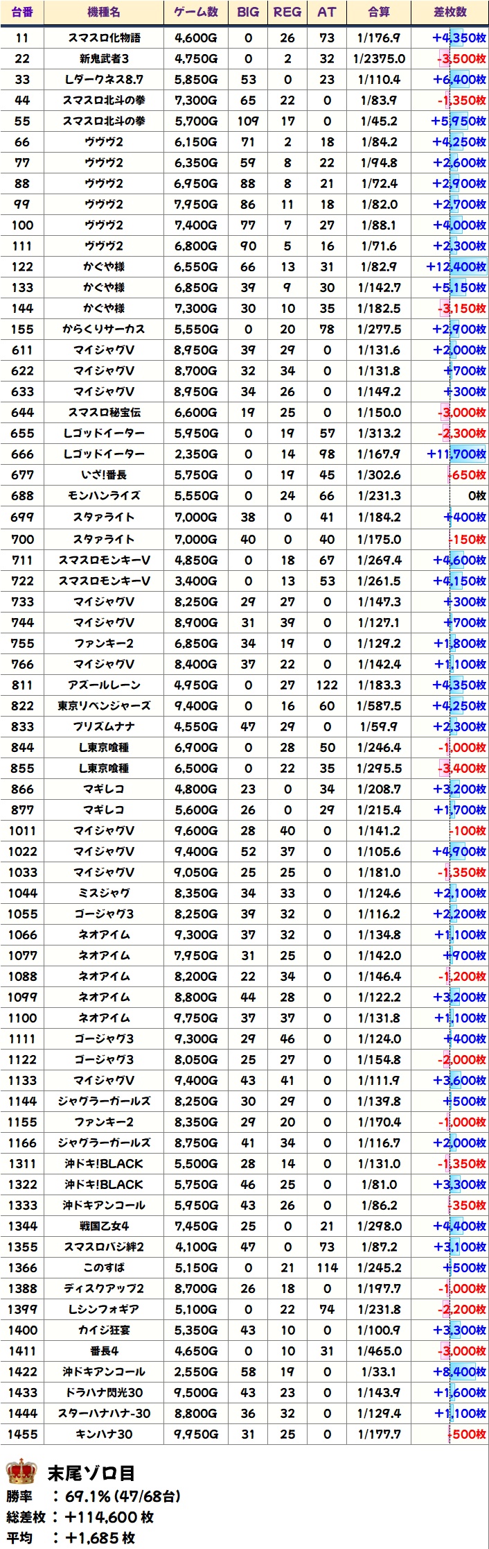 末尾ゾロ目 (47/68台+) ➡平均 +1685枚