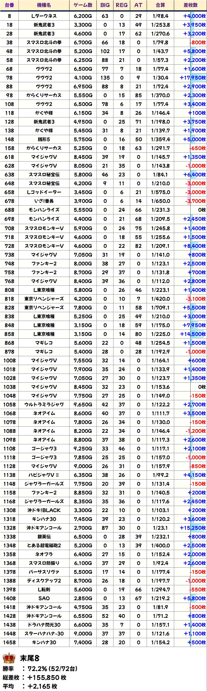 末尾8 (52/72台+) ➡平均 +2165枚