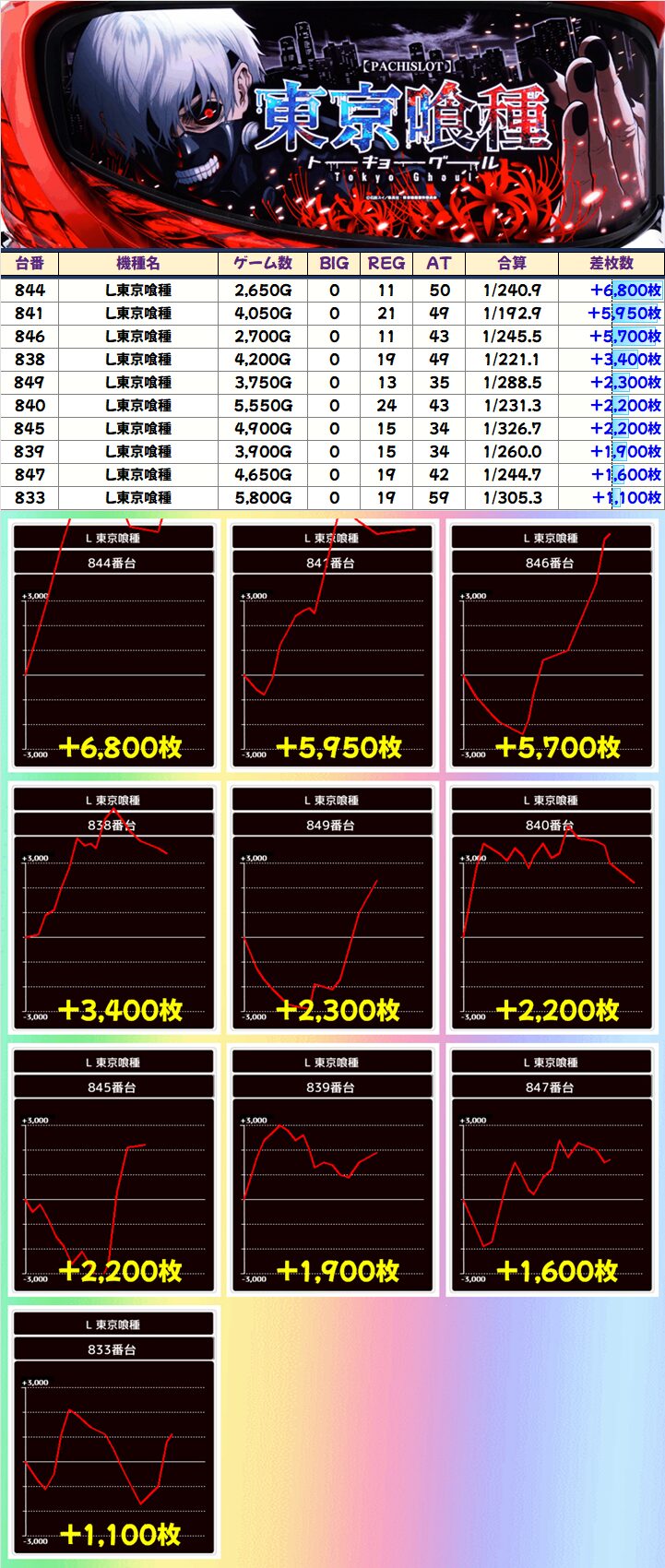 東京喰種の10日間ポスターの最終日は、前述した通り3台以上並びが複数あったこともあり出玉充実!+6000枚クラス×3台など計10台が+1000枚を突破!