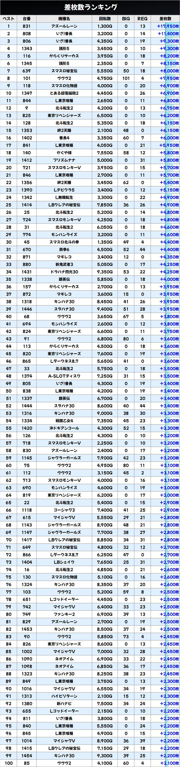 「推し押せ!」ということで多彩な機種に優秀台があり、下のランキングにある通り約100台が+2000枚を突破!