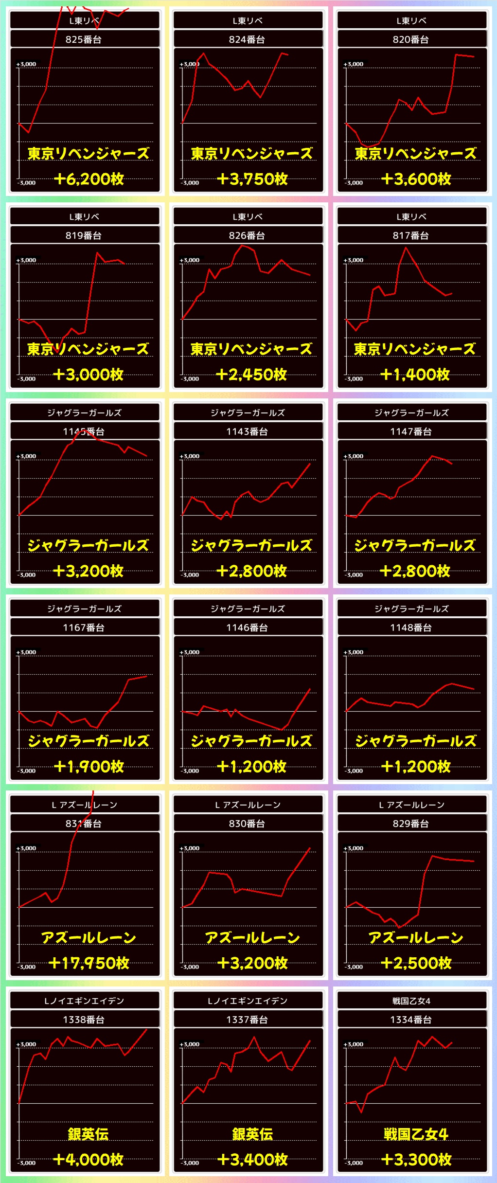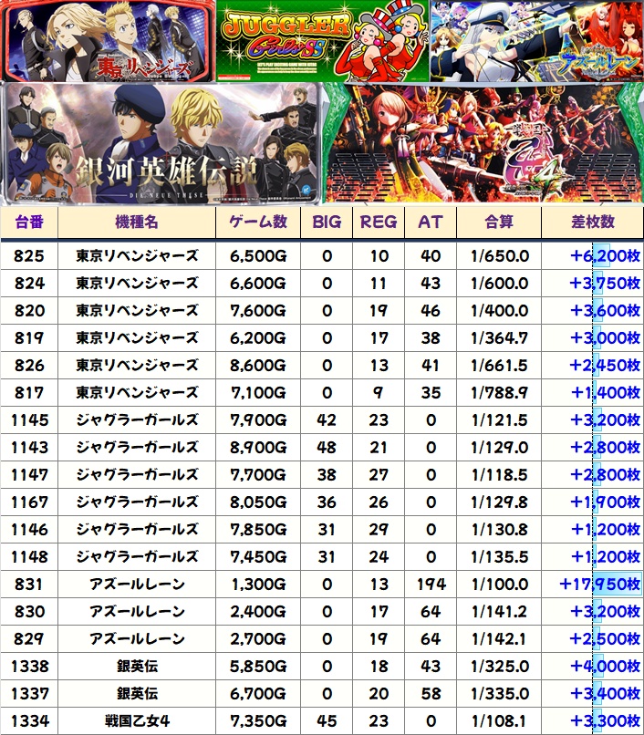 「アズールレーン」のコンプ台など各機種に+3000枚以上の優秀台があり、全5機種が平均+1000枚以上としっかり結果を残していました!