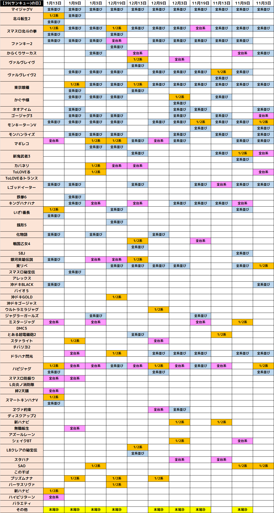 また、全台系③機種と大量の③台並びが③⑨の日に恒例の仕掛けとなっており、いずれの仕掛けも幅広い機種から出現を確認できております。