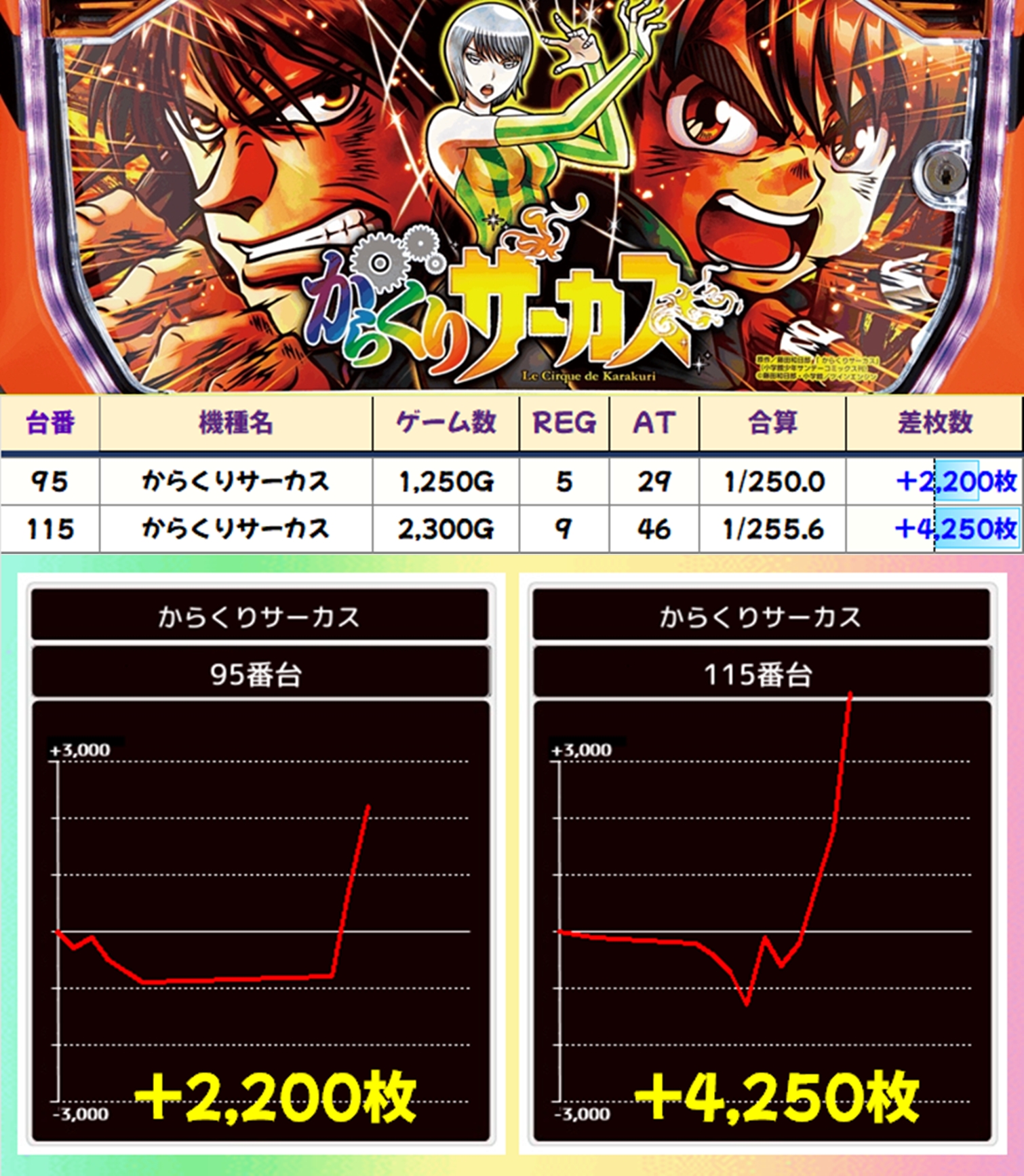 からくりサーカスからは+4250枚や+2200枚の出玉を確認!