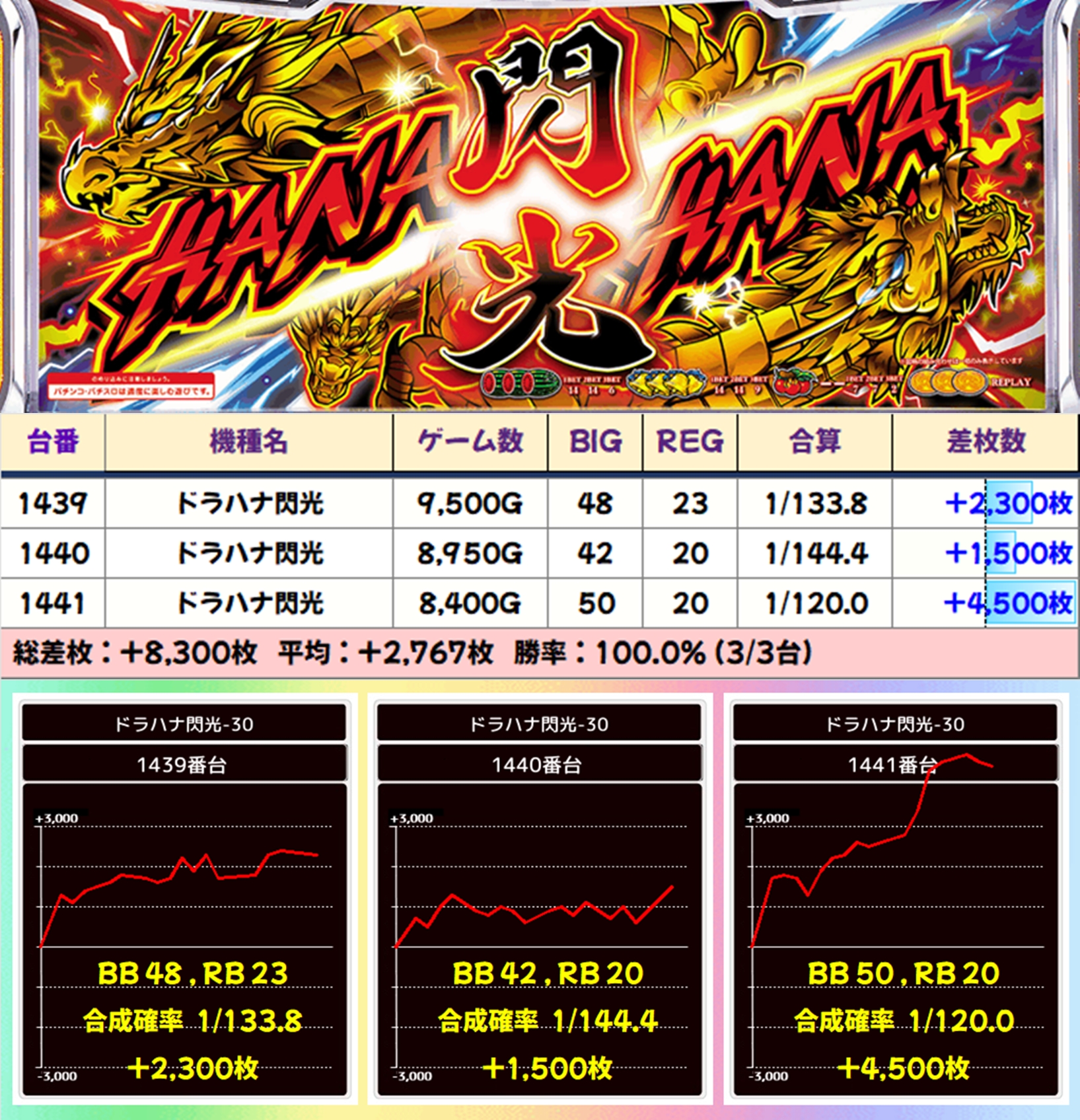 【3台並び】ドラハナ閃光(1439-1441番台)→平均+2,767枚