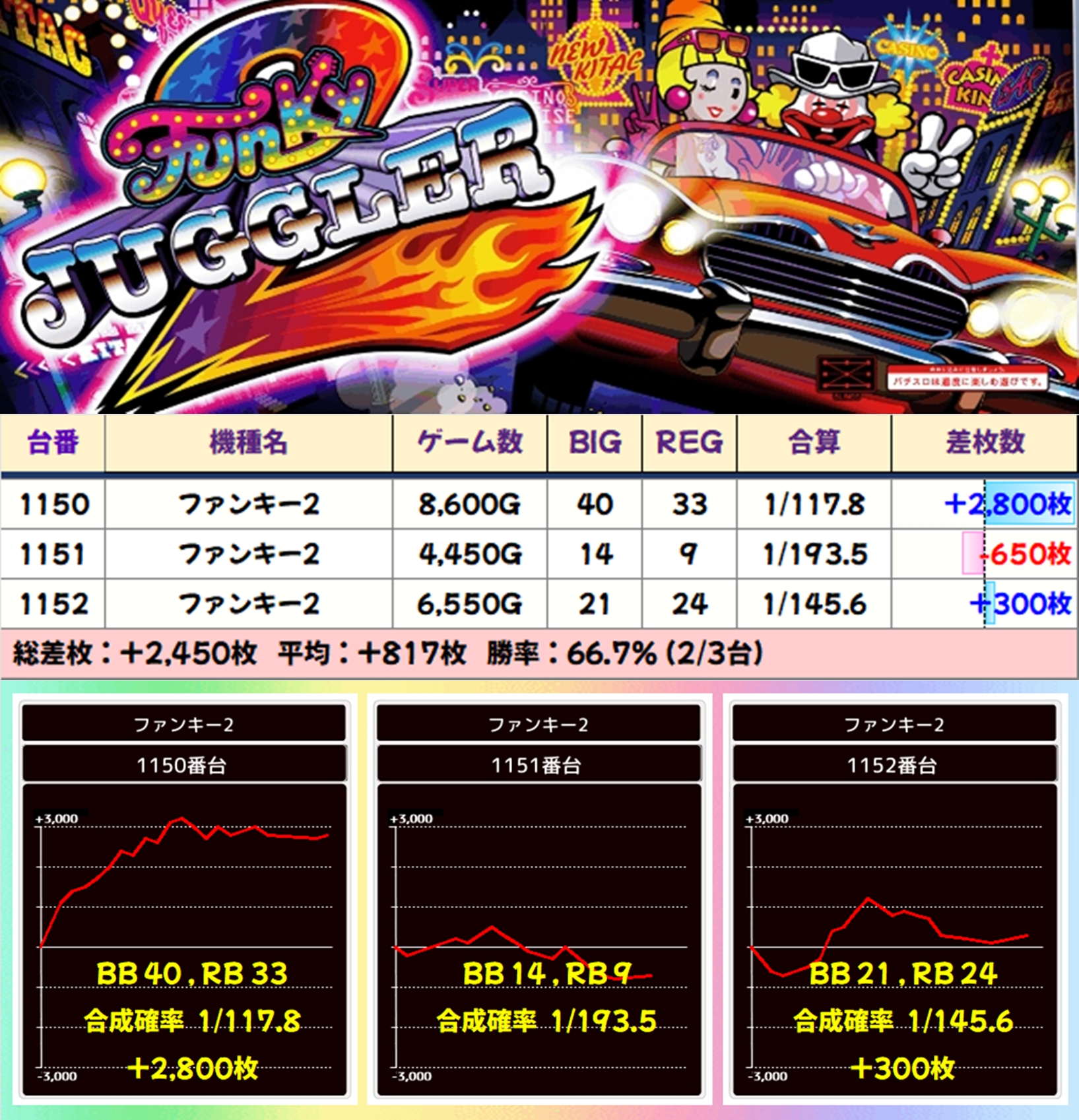 【3台並び】ファンキー2(1150-1152番台)→平均+817枚