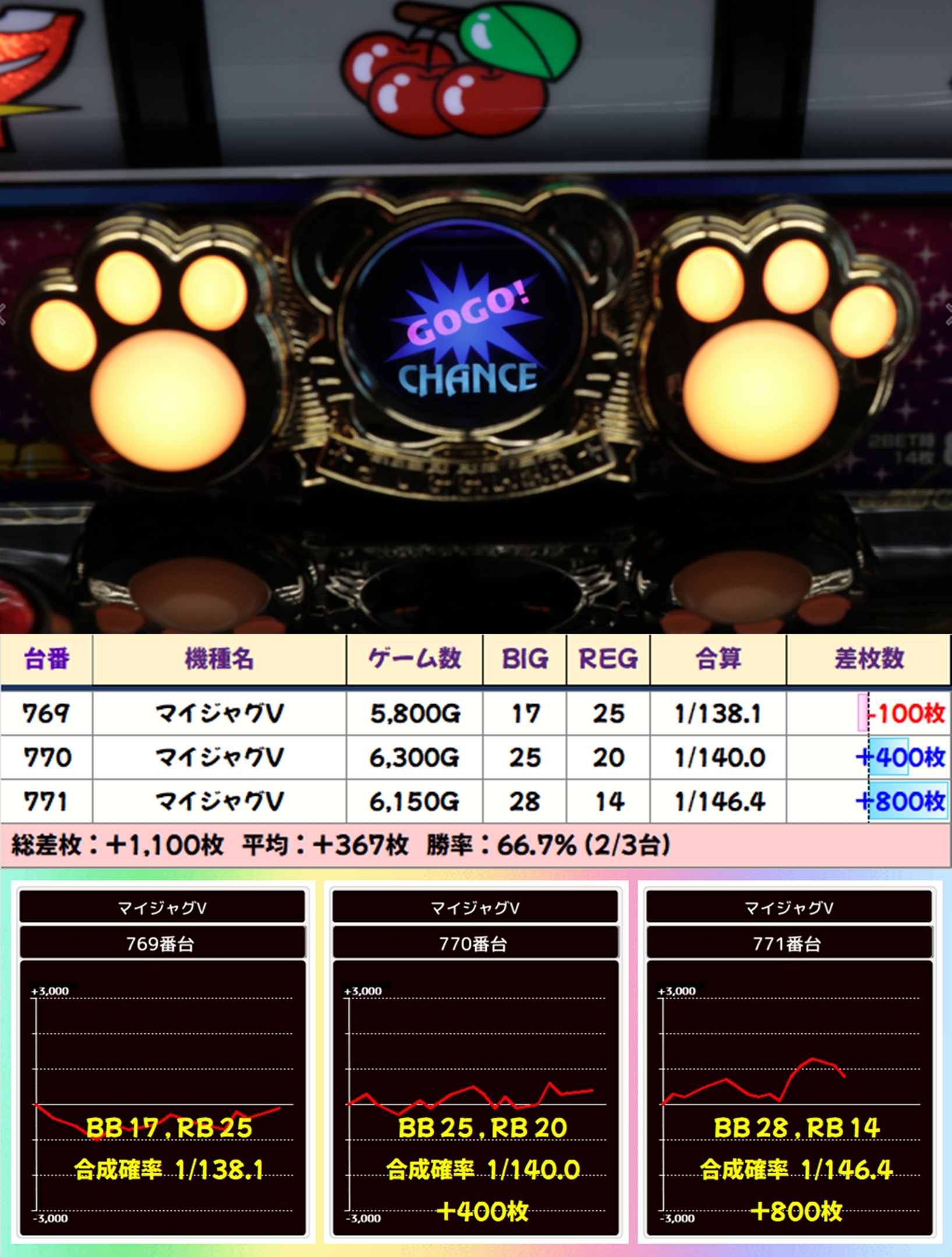 【3台並び】マイジャグV(769-771番台)→平均+367枚