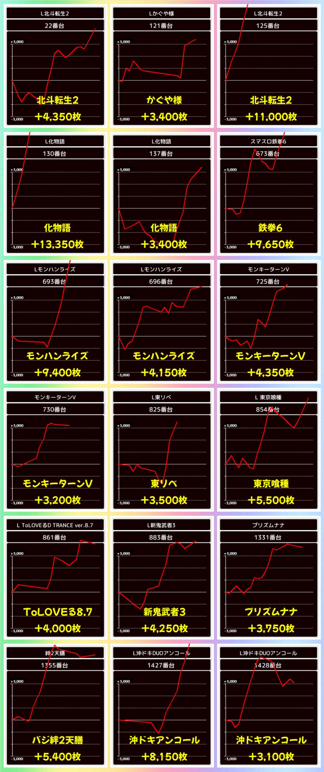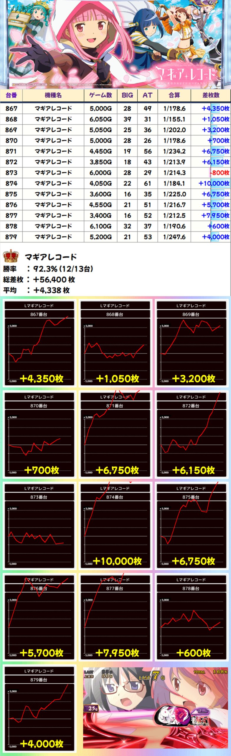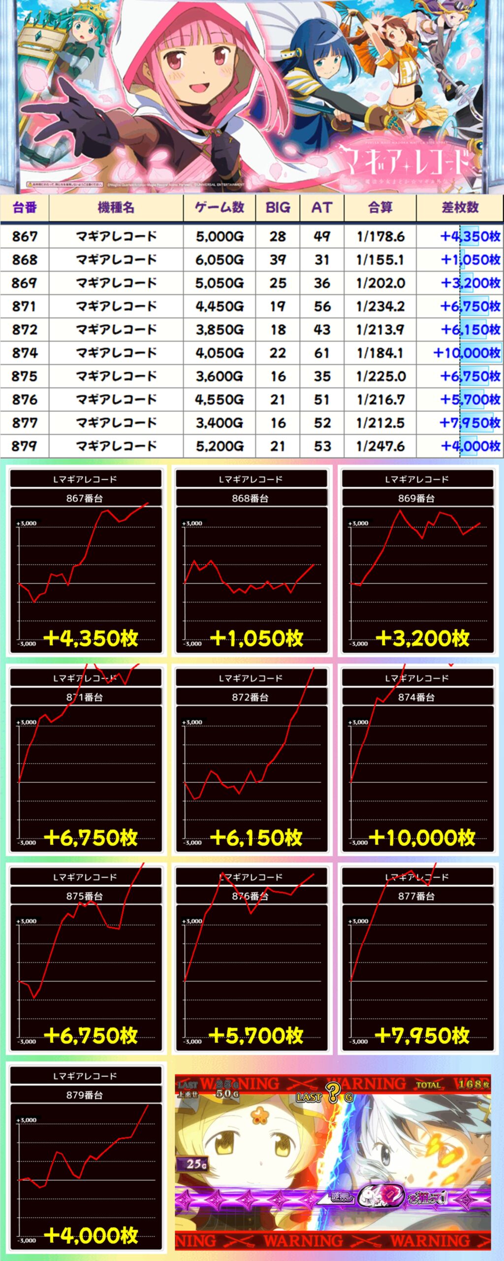 かぶぱポストにヒントがあり、10日間ポスターが出現しているマギアレコードは全台系濃厚で+10000枚の爆裂台を筆頭に大量出玉が多数。不発気味の台もありましたが、平均では+4300枚超と見事な結果を残しました。