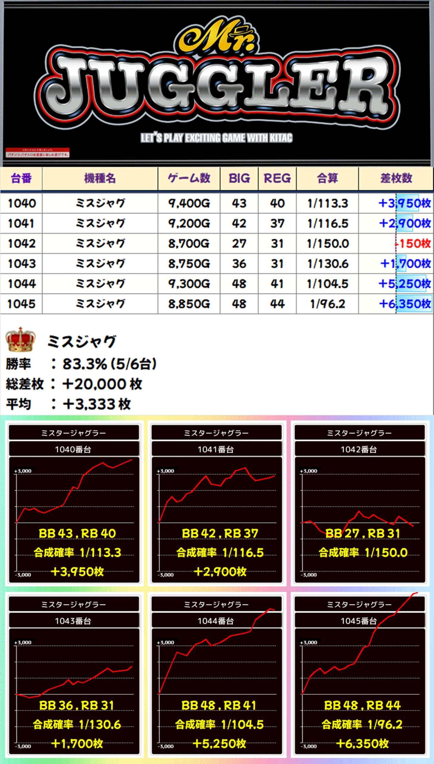 ミスジャグもかぶぱポストにヒントがあり、こちらも全台系濃厚。+6350枚や+5250枚などプラスとなった台はいずれも優秀な出玉を獲得。ボーナス出現率から察するに全台てっぺんだったのかも!?