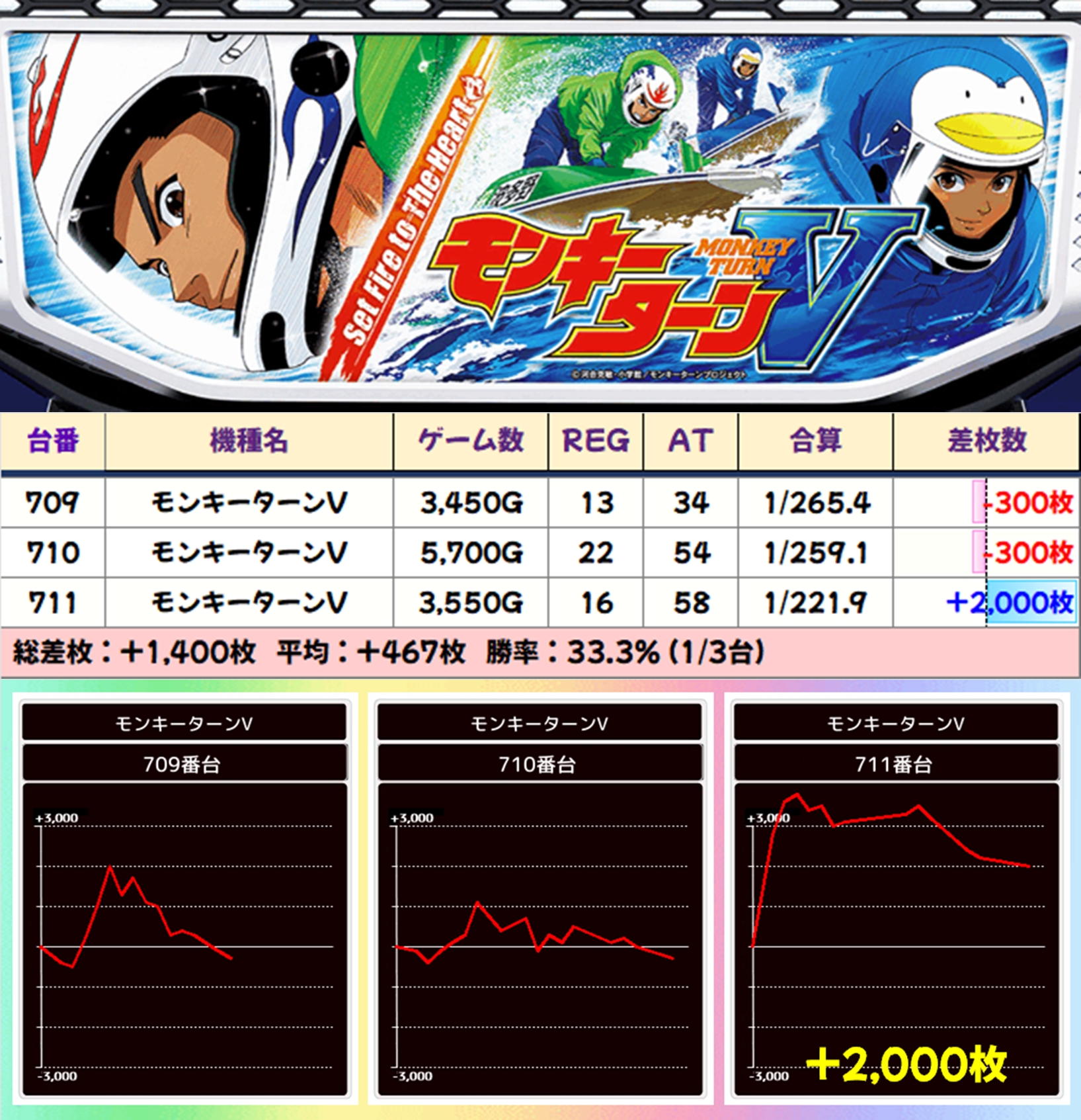 【3台並び】モンキーターンV(709-711番台)→平均+467枚