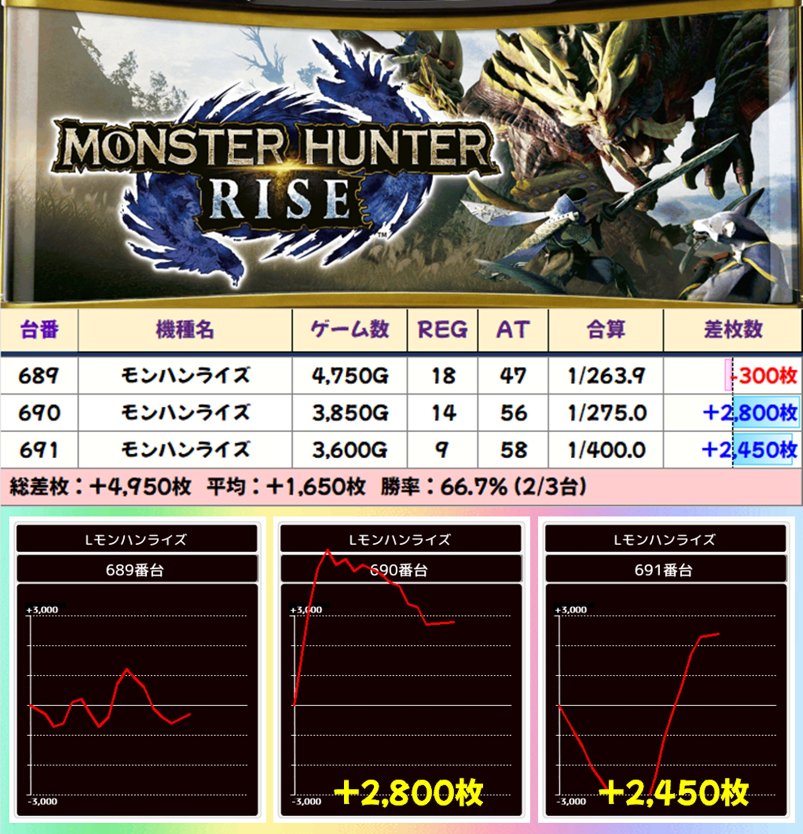 【3台並び】モンハンライズ(689-691番台)→平均+1,650枚