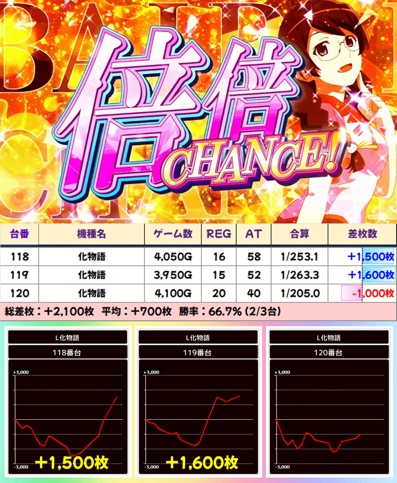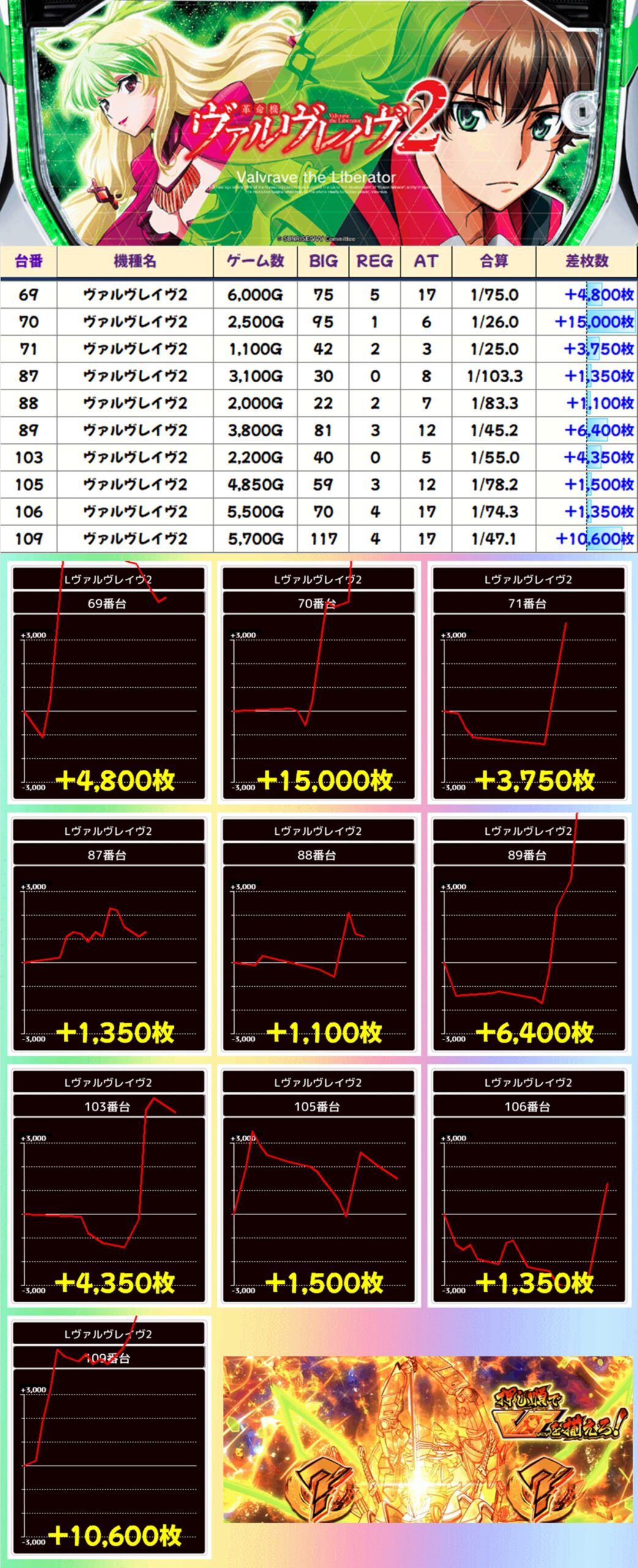 初代は不発でしたが、2からは+15000枚、+10600枚と万枚オーバーの爆裂が2台出現。それ以外にも優秀な出玉を確認できました!