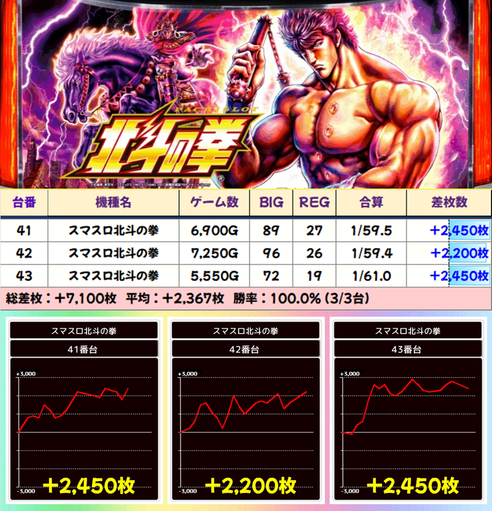 【3台並び】スマスロ北斗の拳(41-43番台)→平均+2,367枚