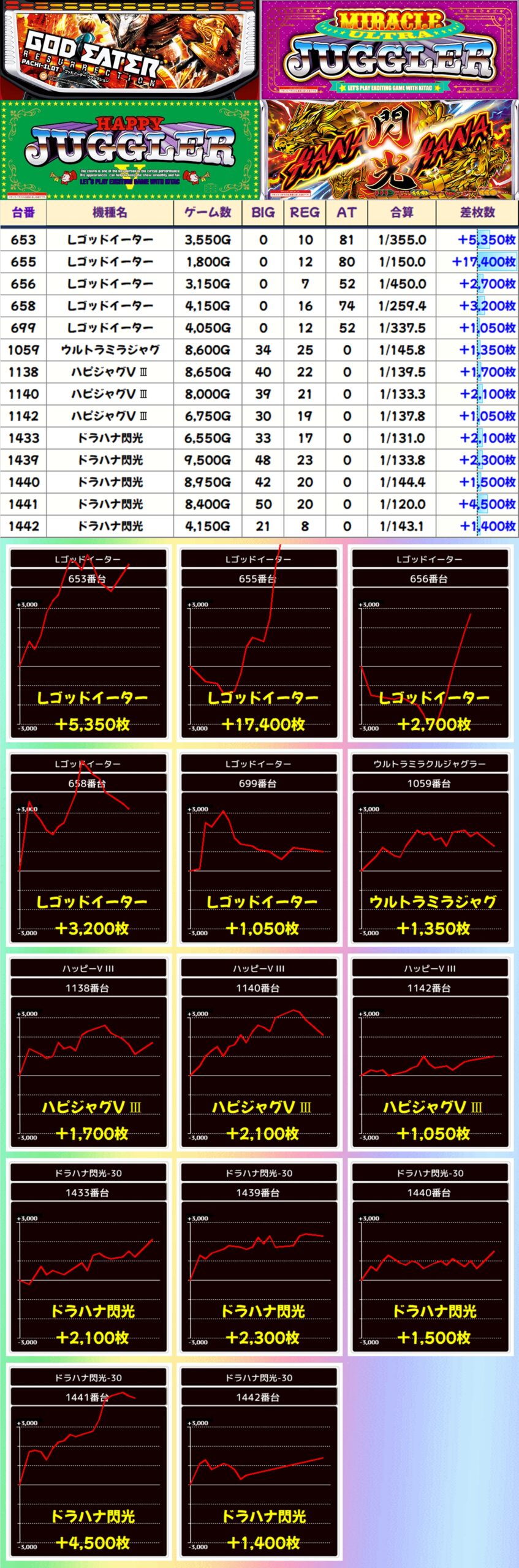 新ポスター登場中の機種からは毎日お宝台を複数確認できておりますが、明日は10日間ポスターの最終日となります。お宝台の大量出現に期待したいですね!
