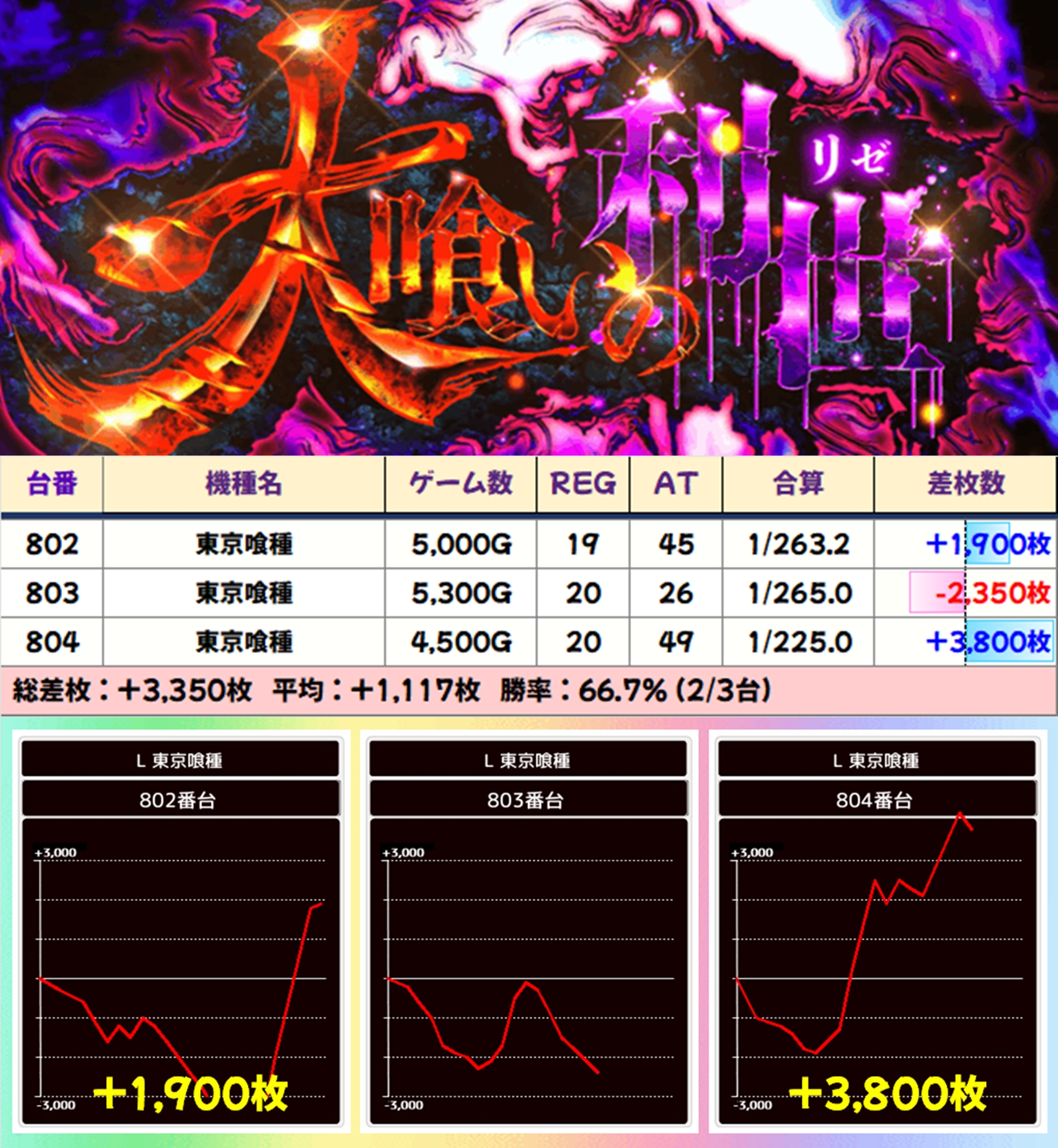 【3台並び】東京喰種(802-804番台)→平均+1,117枚
