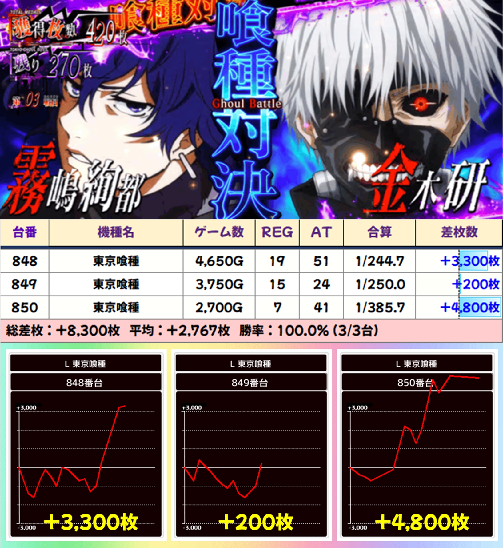 【3台並び】東京喰種(848-850番台)→平均+2,767枚