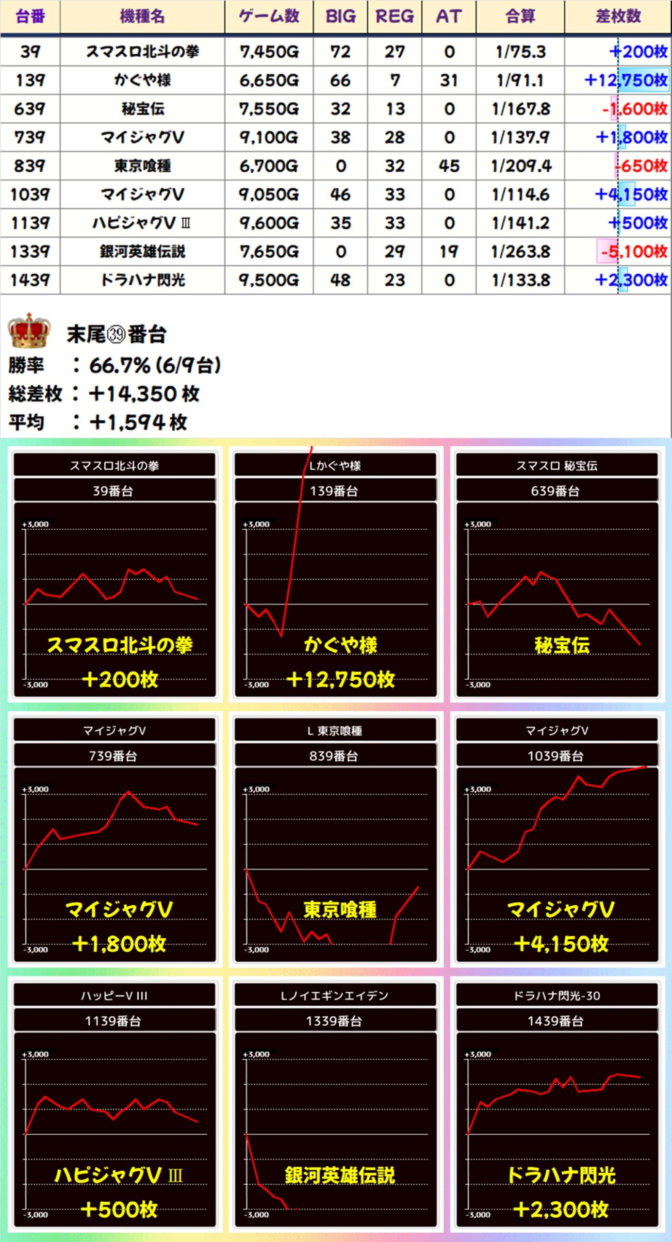 末尾㊴番台(6/9台+)→平均+1,594枚