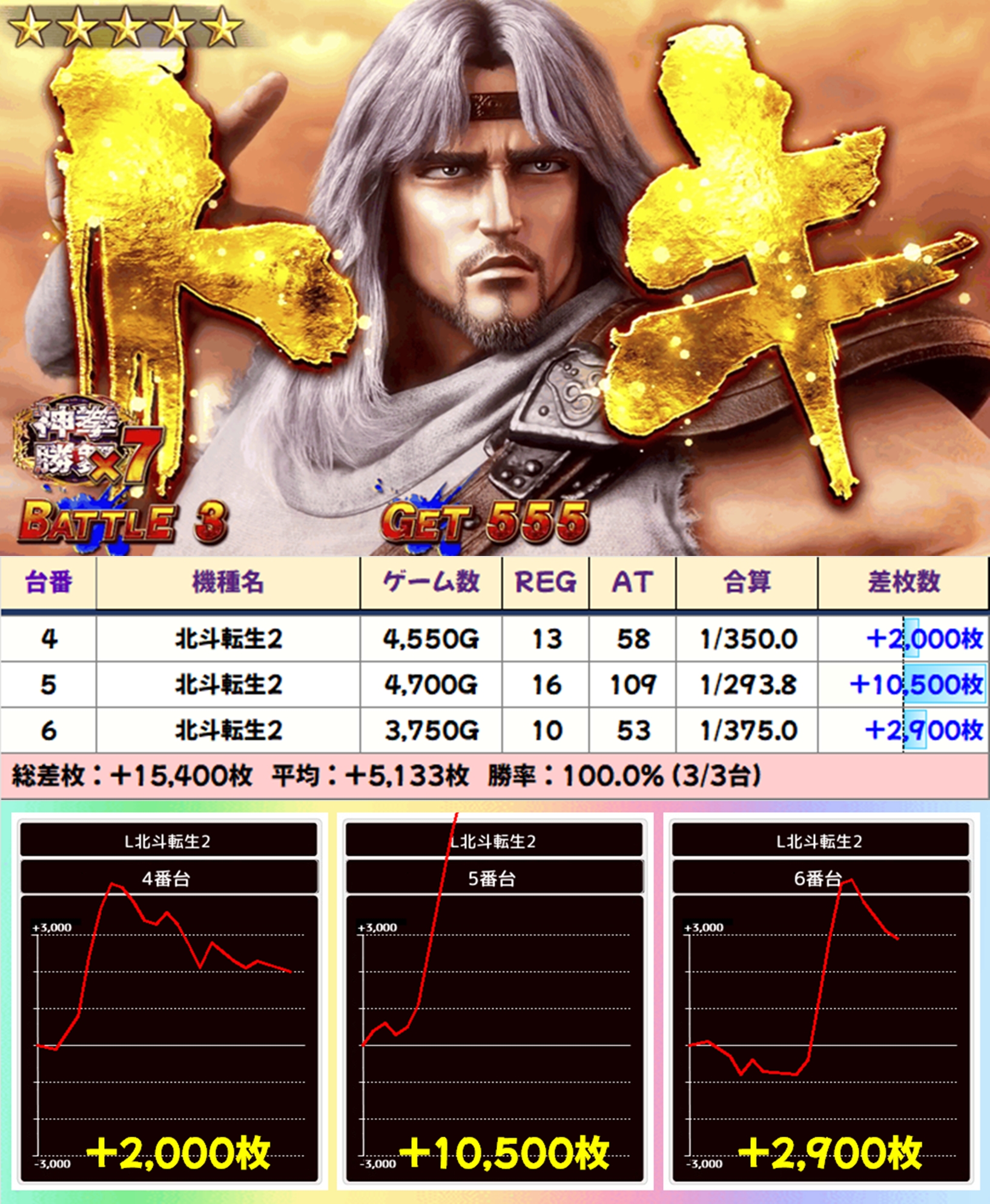 【3台並び】北斗転生2(4-6番台)→平均+5,133枚