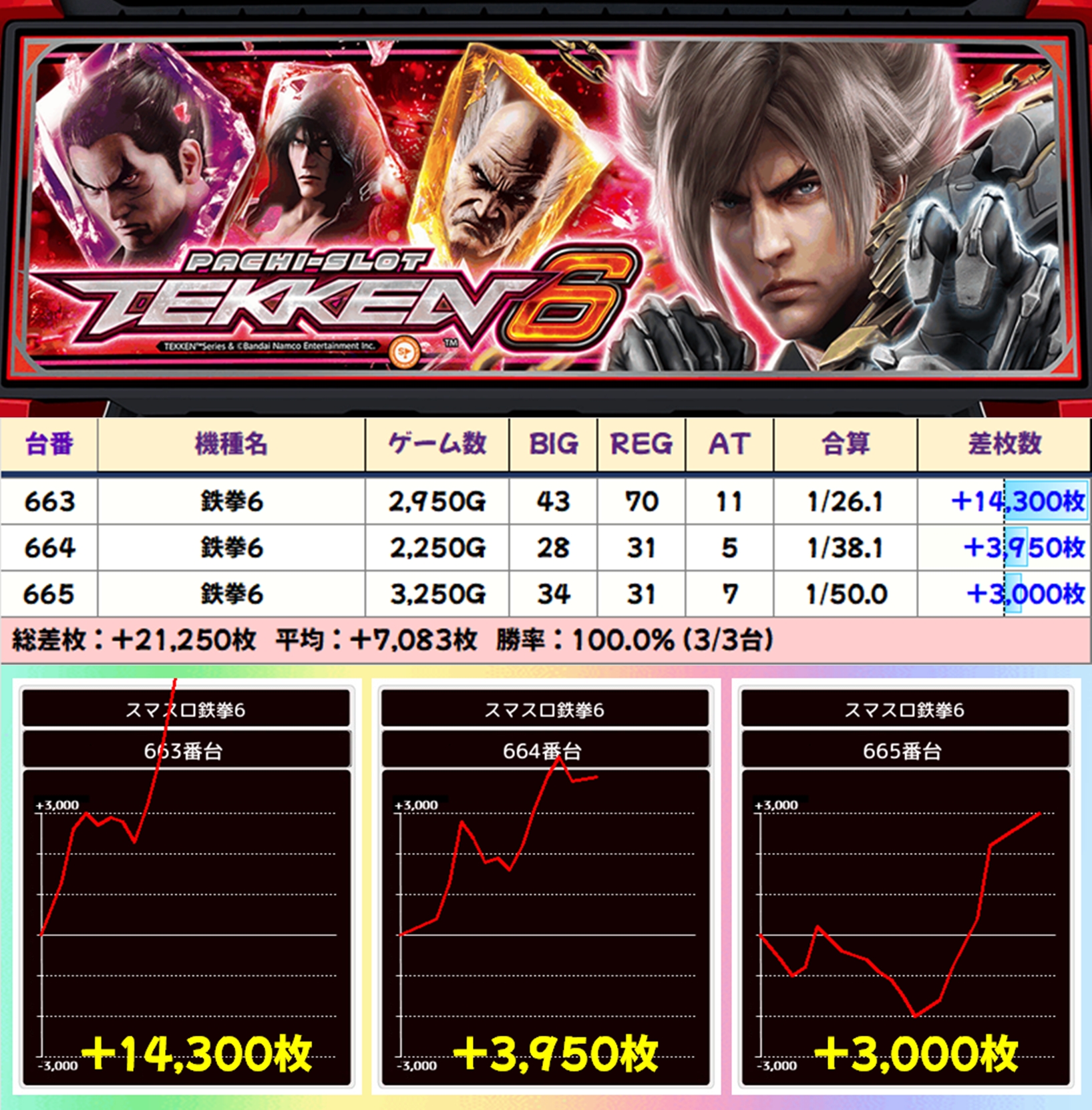 【3台並び】鉄拳6(663-665番台)→平均+7,083枚