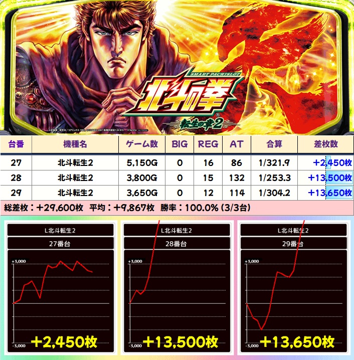 【3台並び】北斗転生2(27-29番台)➡平均+9867枚