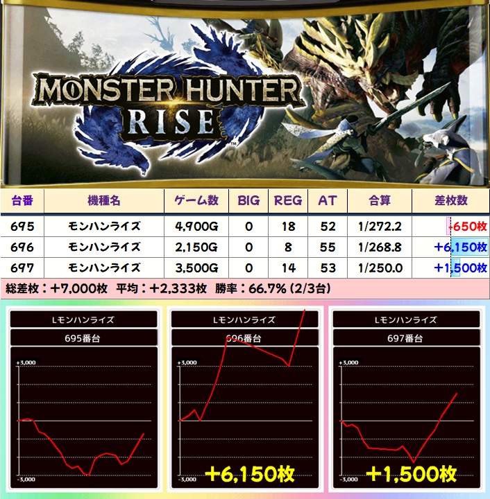 【3台並び】モンハンライズ(695-697番台)➡平均+2333枚