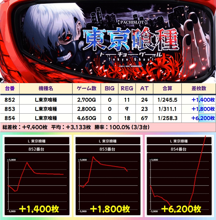 【3台並び】東京喰種(852-854番台)➡平均+3,133枚