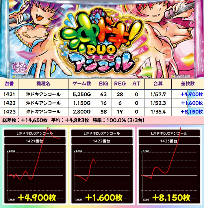 【3台並び】沖ドキアンコール(1421-1423番台)➡平均+4,883枚