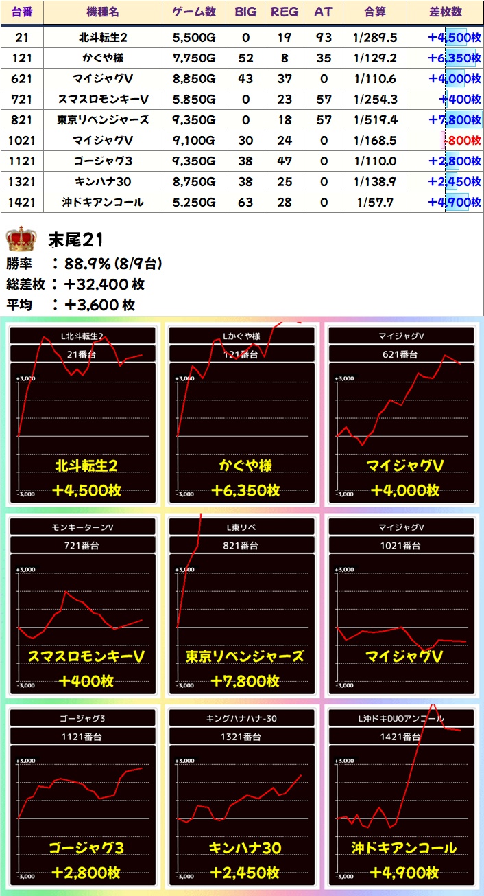 末尾21(8/9番台)➡平均+3,600枚