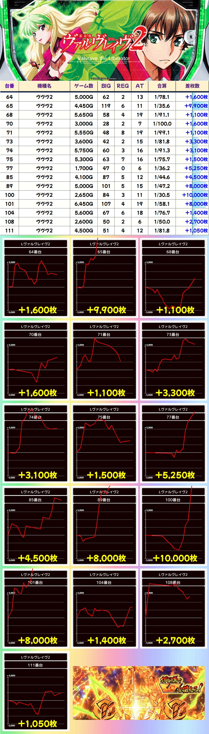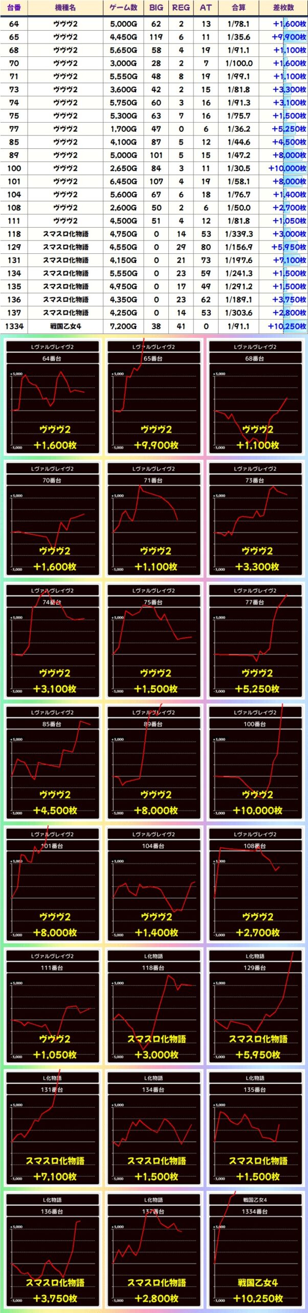 高配分と思わしき機種も全機種プラス差枚!ヴヴヴ2や戦国乙女4は万枚超台ありと賑わっていました!