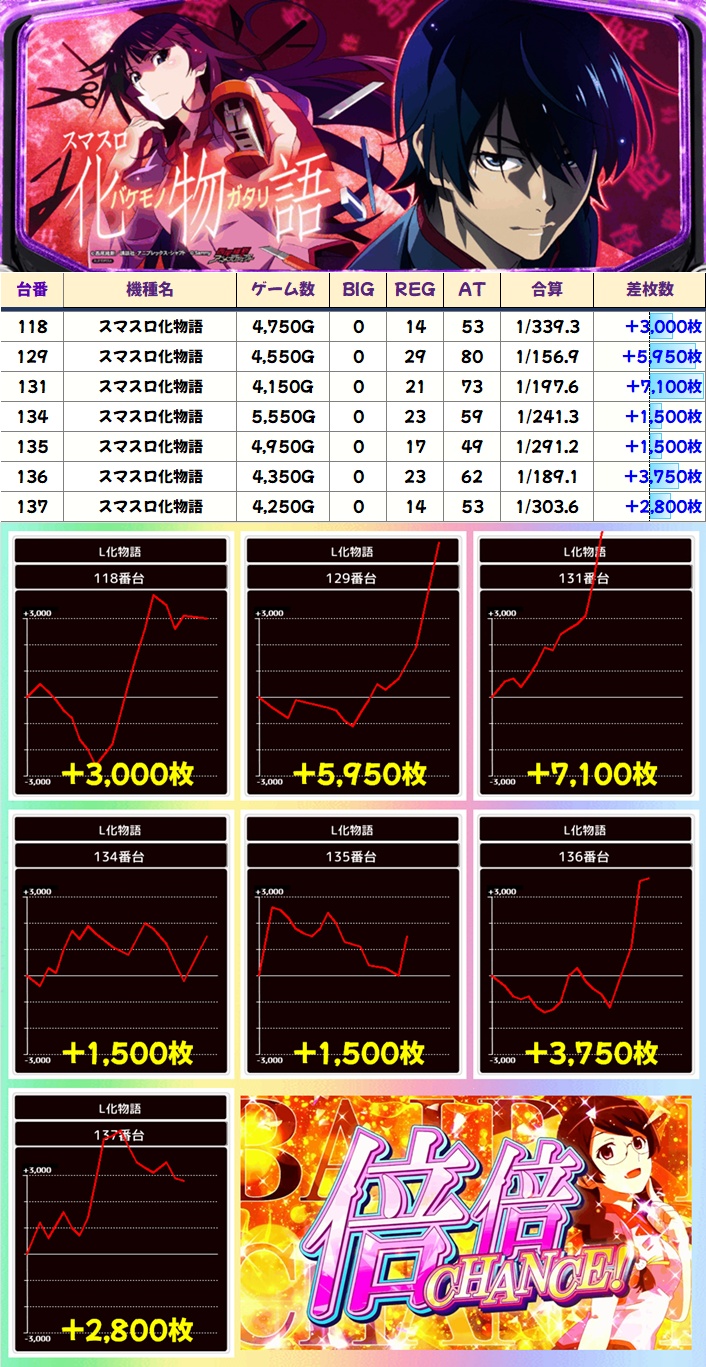高配分だった化物語にも3000枚超台が複数出現!