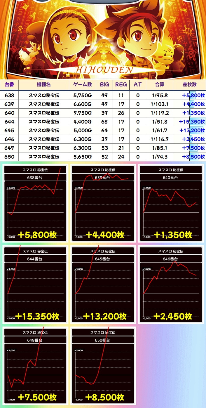秘宝伝は全台系濃厚だったこともあり万枚超2台、5000枚超3台と優秀台大量!