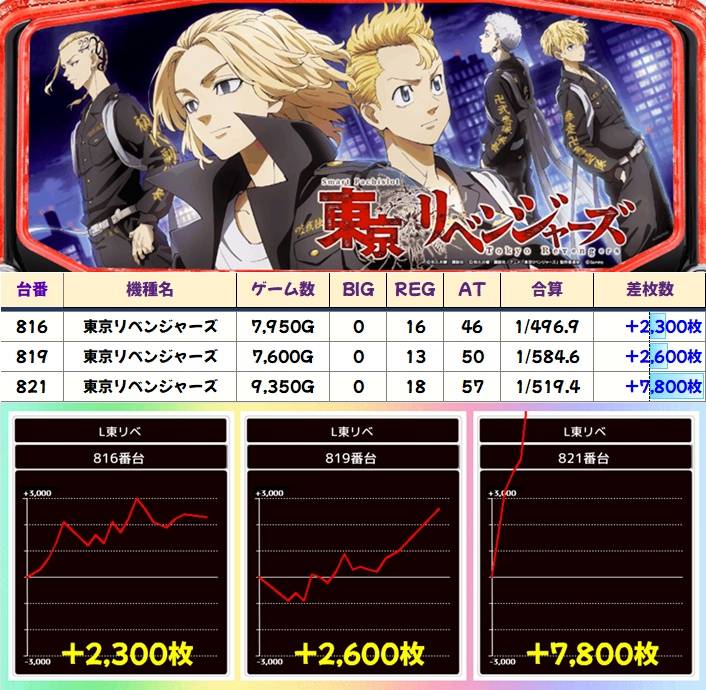 今回は仕掛けには絡んでいなかった東リべにも7000枚超台あり!明日以降の強烈仕掛けに期待!