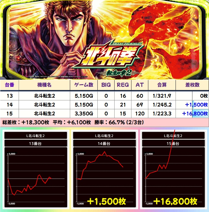 【3台並び】北斗転生2(13-15番台)➡平均+6,100枚