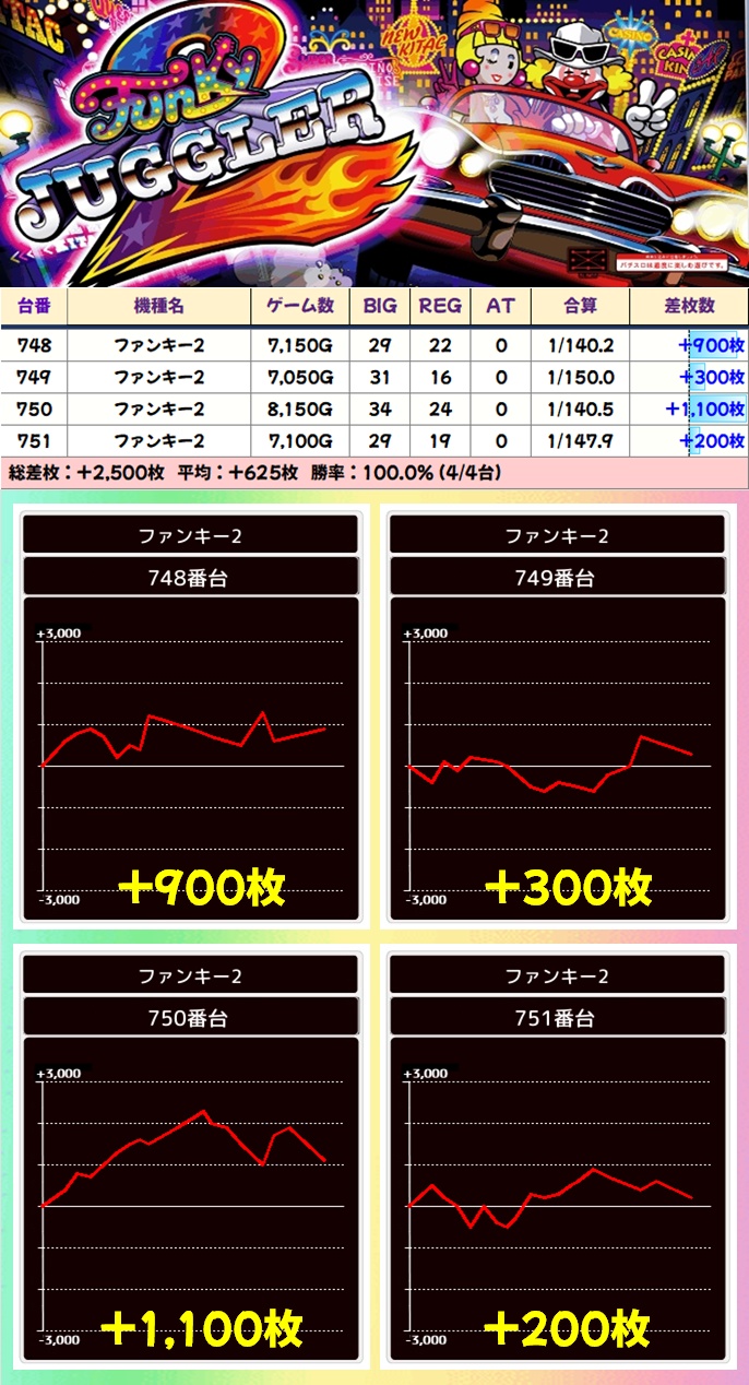 【4台並び】ファンキー2(748-751番台)➡平均+625枚