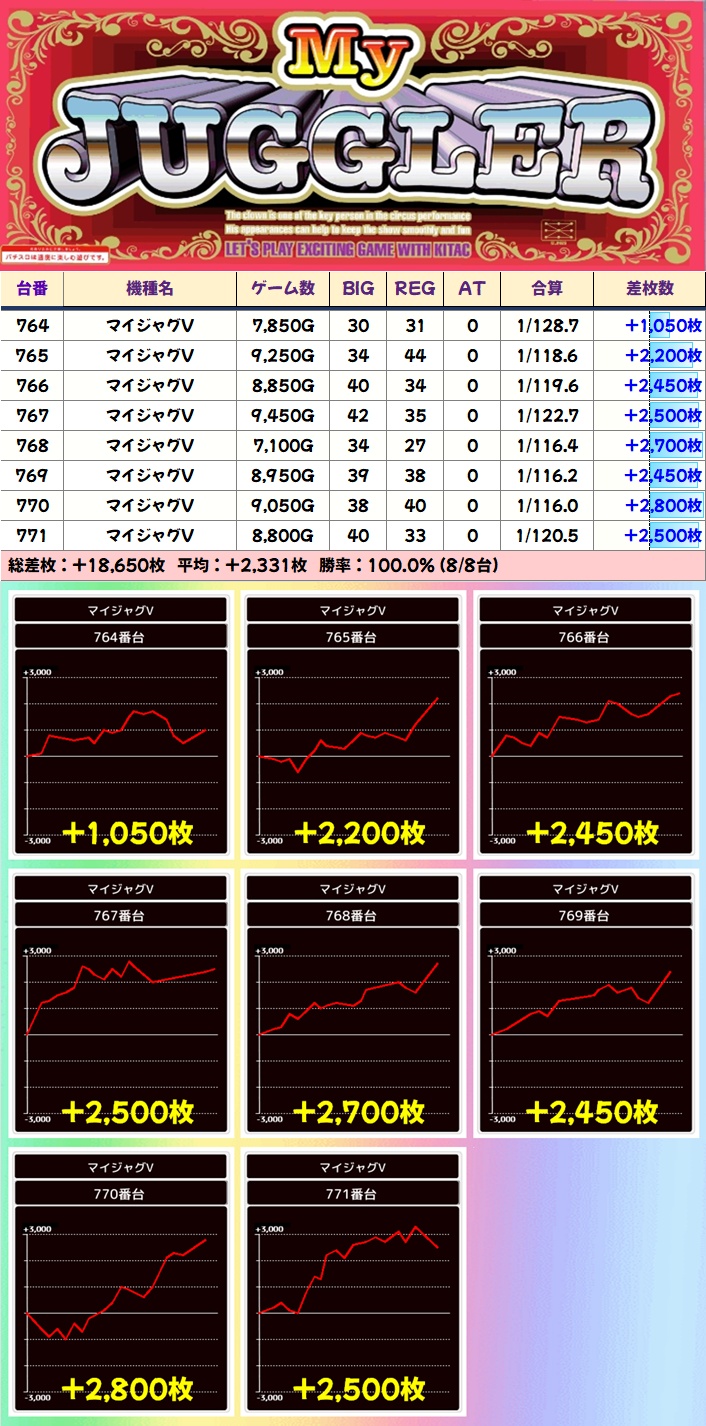 【8台並び】マイジャグV(764-771番台)➡平均+2331枚