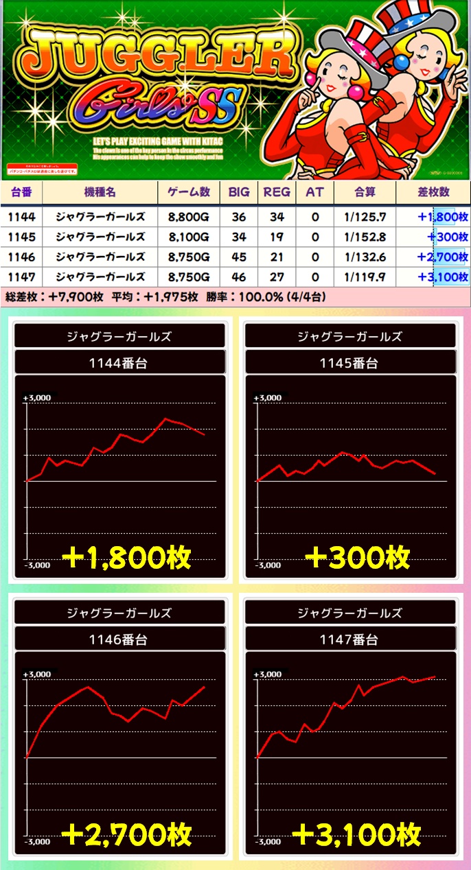 【4台並び】ジャグラーガールズ(1144-1147番台)➡平均+1975枚