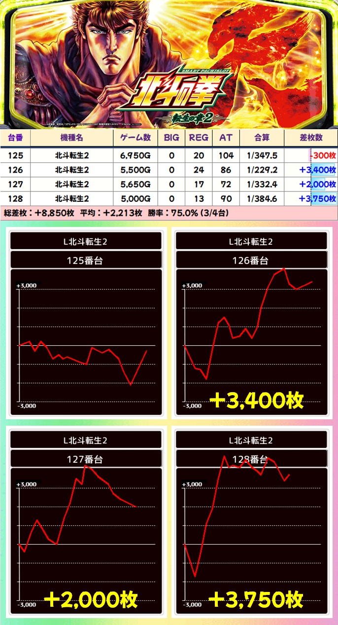 【4台並び】北斗転生2(125-128番台)➡平均+2213枚