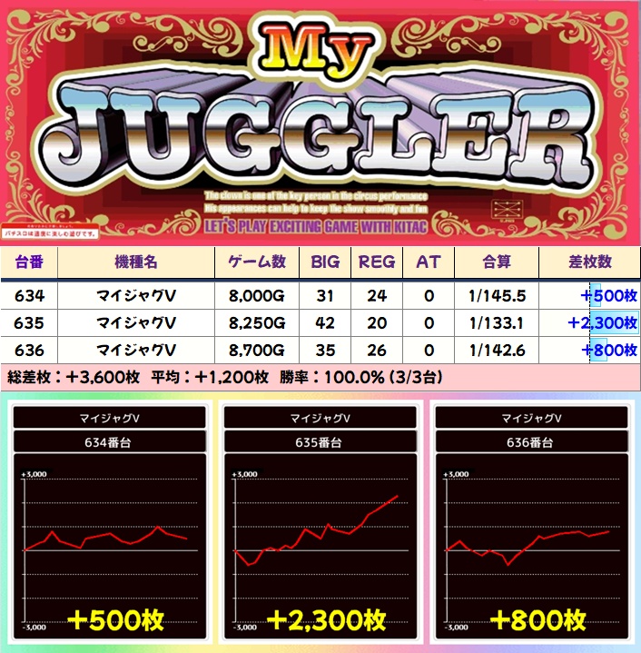 【3台並び】マイジャグV(634-636番台)➡平均+1,200枚