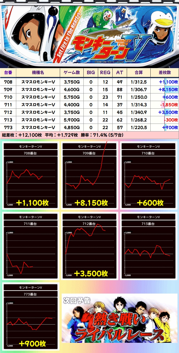 【7台並び】モンキーターンV(708-713・773番台)➡平均+1,729枚