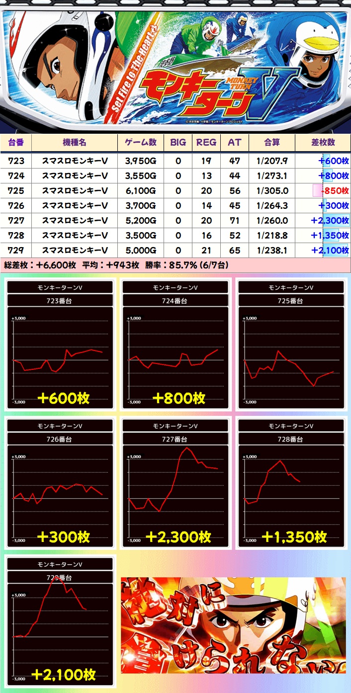 【7台並び】モンキーターンV(723-729番台)➡平均+943枚