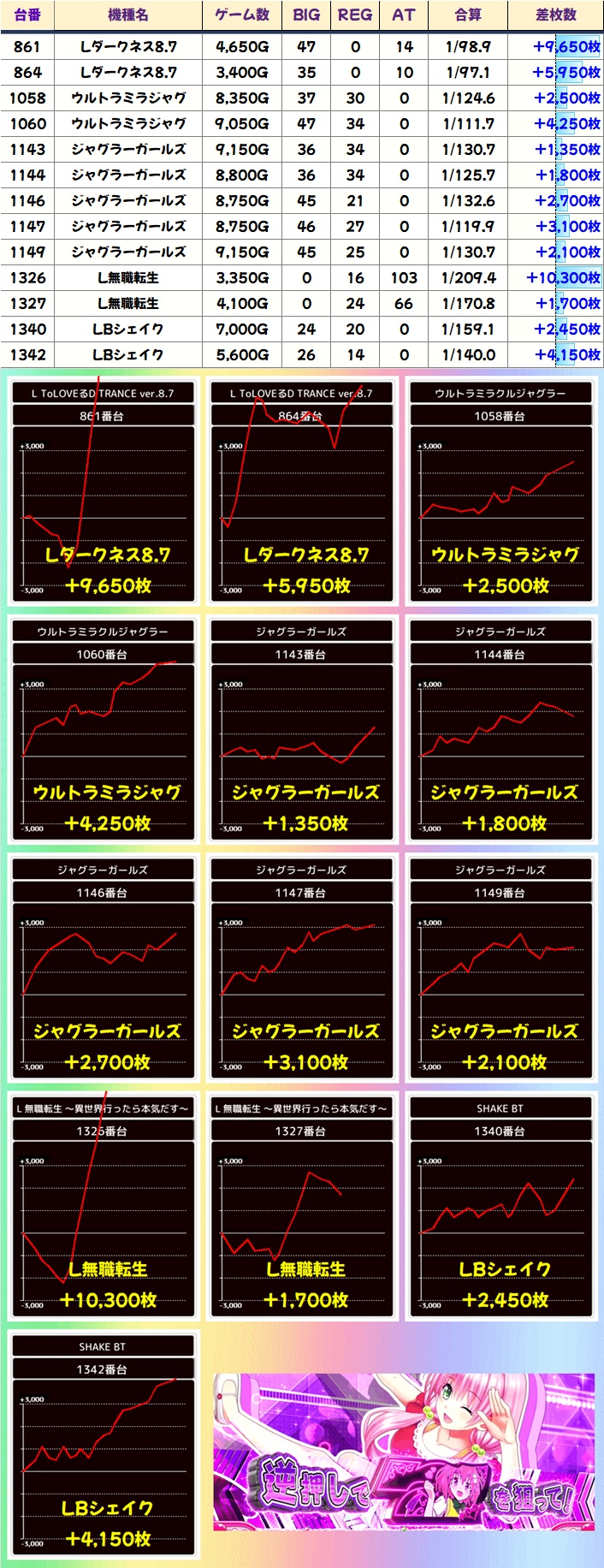 各機種優秀台があり、無職転生やToLOVEる8.7からは万枚クラスも出現!