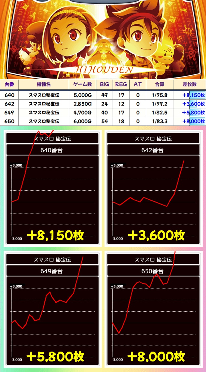 秘宝伝は5000枚超や8000枚超複数など、出玉を伸ばした優秀台が複数出現!